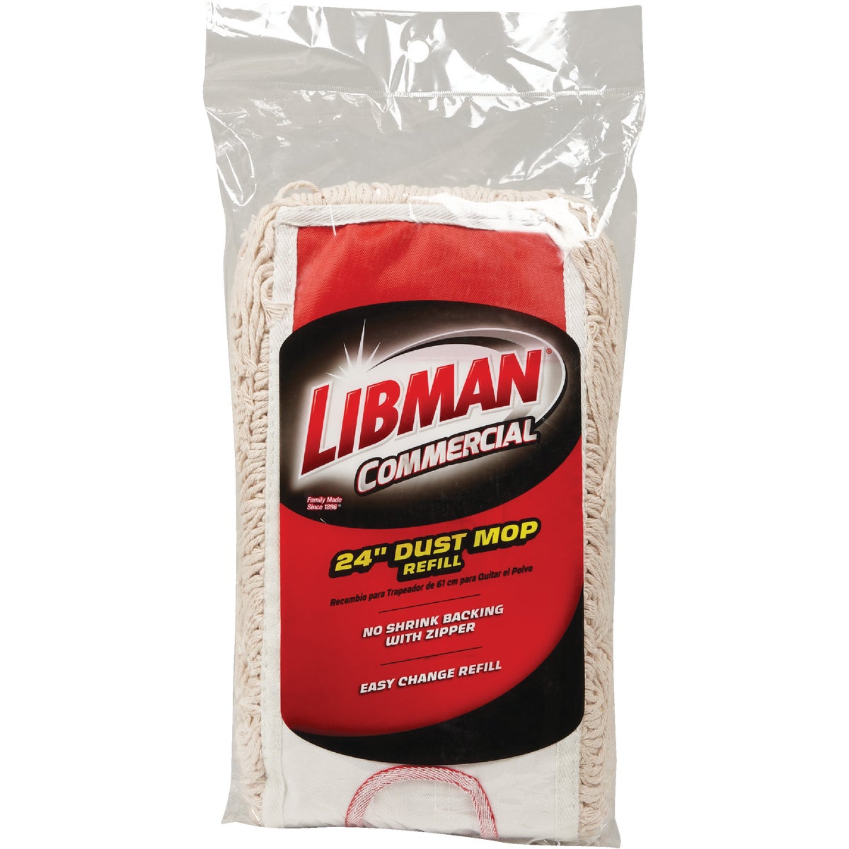 24 In. dust mop head is perfect for cafeterias, gymnasiums, hallways, and other large commercial spaces. Zipper opening makes changing the mop head simple. Machine washable.