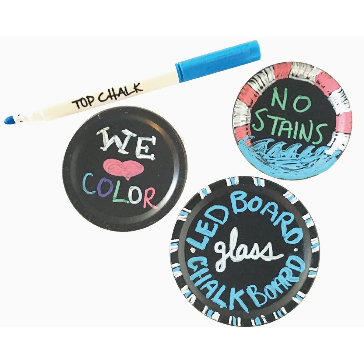 Vibrant fine-point liquid chalk markers write on chalkboards, LED (light emitting diode) boards, glass, and more. Wipes away with a damp cloth - does not stain chalkboard surfaces. Water-based and non-toxic. Includes: 2 white, 1 red, 1 blue, 1 green, and 1 purple.