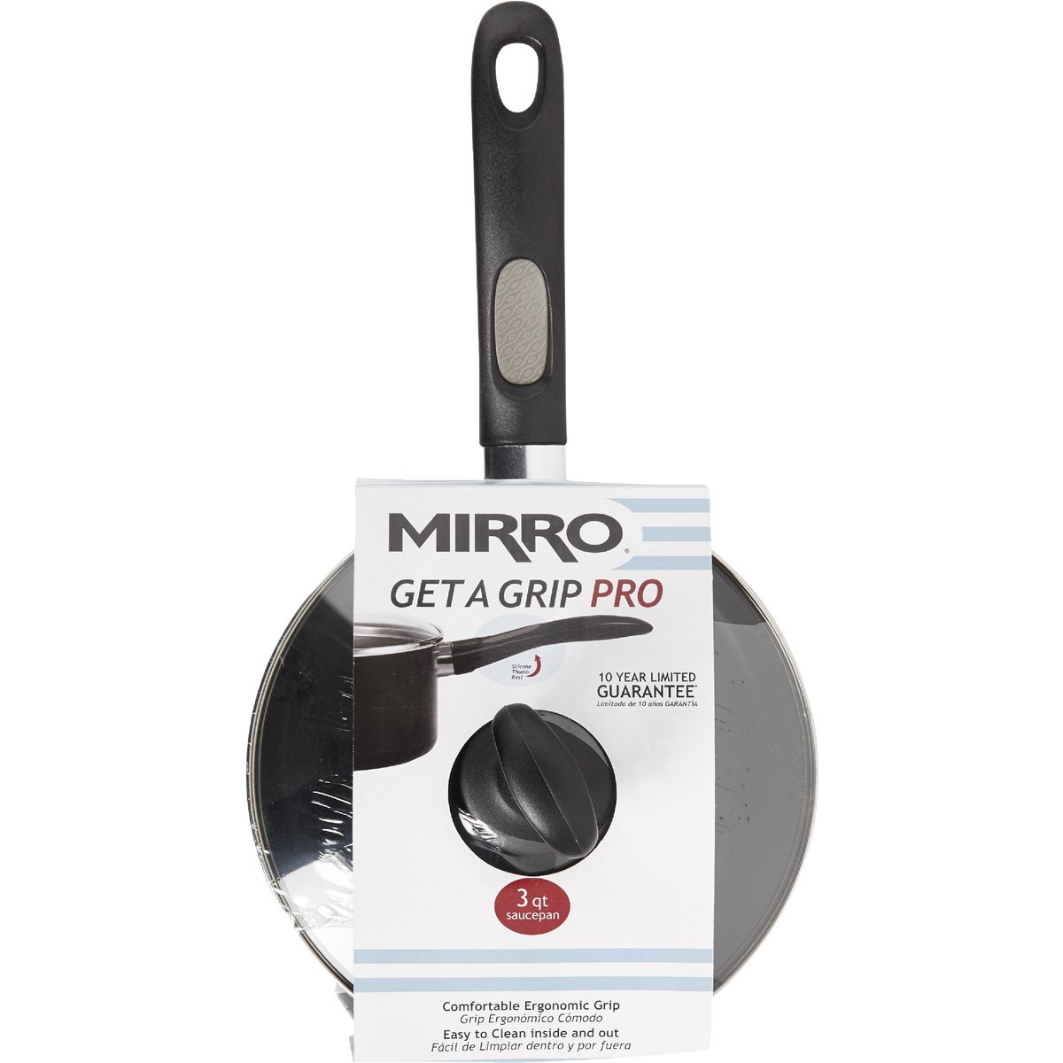 3 Qt. covered sauce pan's ergonomic handle made of tough plastic will stay cool on the stovetop and is oven-safe to 350 degree F. Welded handle has no inside rivets to trap food. Even heat base. Glass lid.