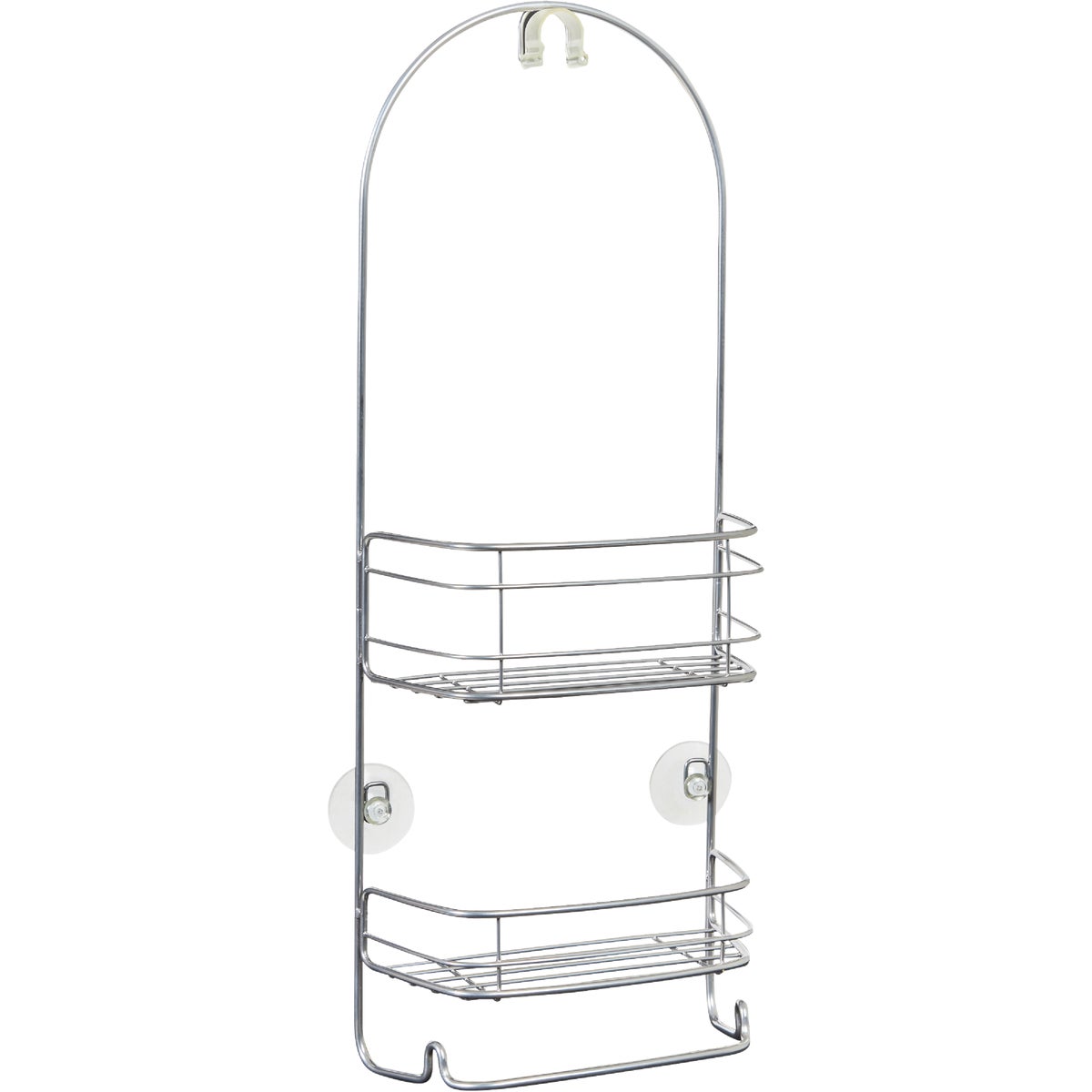 iDesign's Rondo Shower Caddy has a simple design that coordinates with any bathroom decor. It features 2 shelves for storing soaps and shampoos, and a convenient towel bar with 2 hooks. Two suction cups give your caddy extra support and a no-slip grip. Rust-resistant coating. Made of steel with a silver finish. 8.75 In. W. x 4 In. D. x 21 In. H.