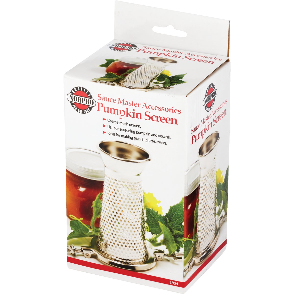 Durable nickel-plated steel with 1/8 In. coarse mesh screen for pumpkin, squash, and more. 6 In. H. x 3.5 In. diameter. Hand washing recommended. Use with Norpro Sauce Master.
