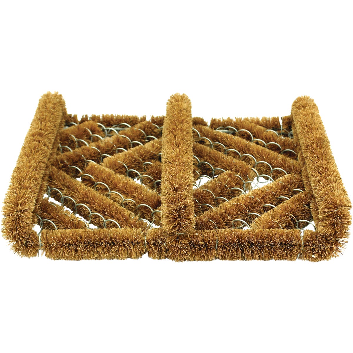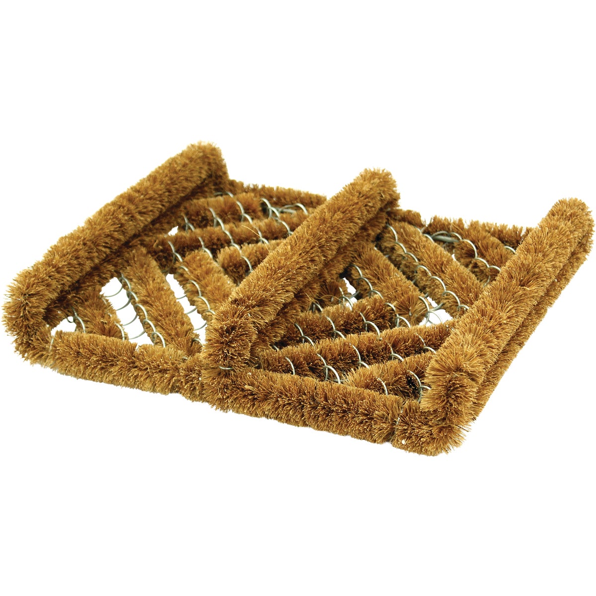 Boot Butler is a 100% natural, environmentally-friendly, coir fiber with wire constructed boot/mud scraper. Removes tough dirt and mud debris, along with sticky grass and snow from the sides and bottom of shoes. Compliments your welcome mats with its practical and functional design in keeping your entrances cleaner. Weather resistant. 12 x 14 x 2.15.