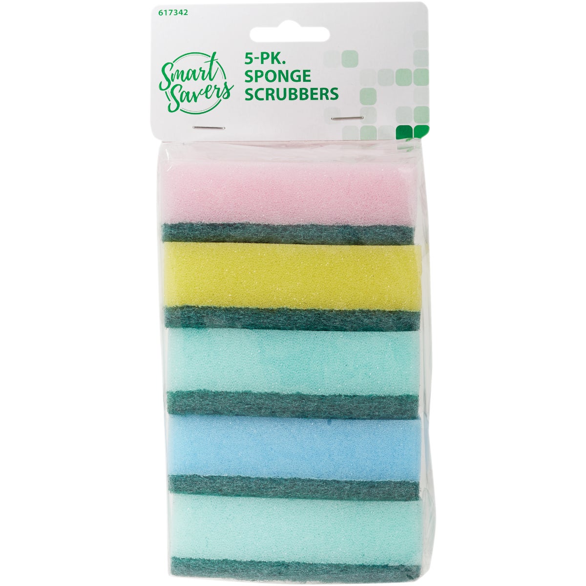 Smart Savers 5-piece sponge scrubbers is ideal for general cleaning. Assorted colors - yellow, pink, blue, green, and white.