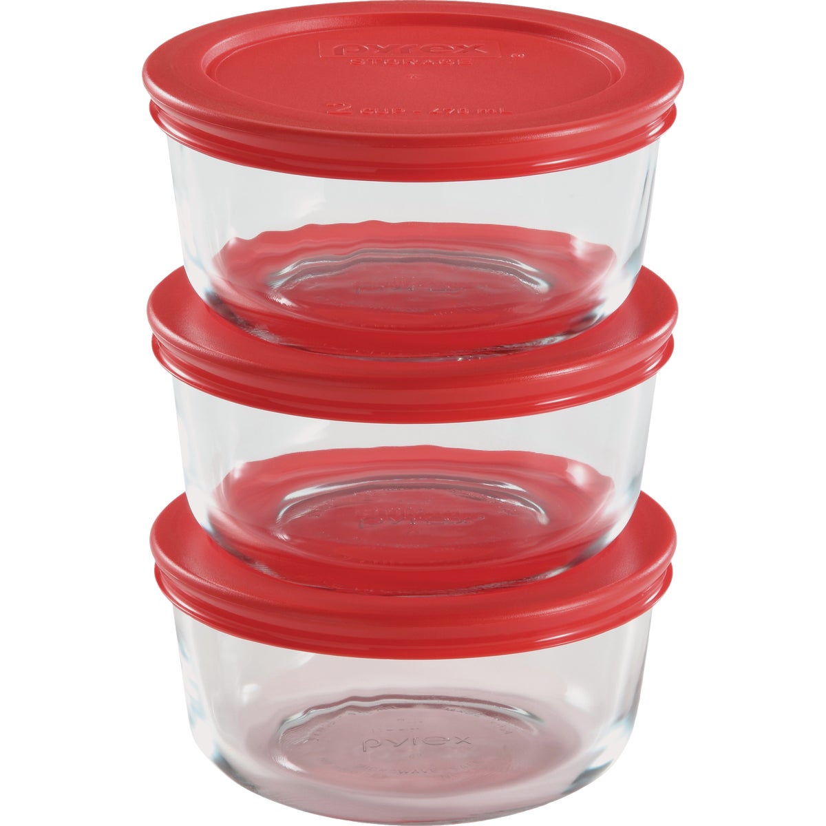 Durable high-quality tempered glass containers resist stains and do not absorb food odors or flavors. Dishwasher, freezer and microwave safe. BPA-free plastic lids. Easily nest and stack with other Pyrex storage. Set includes: (3) 2-cup containers with lids. 2 year limited warranty.