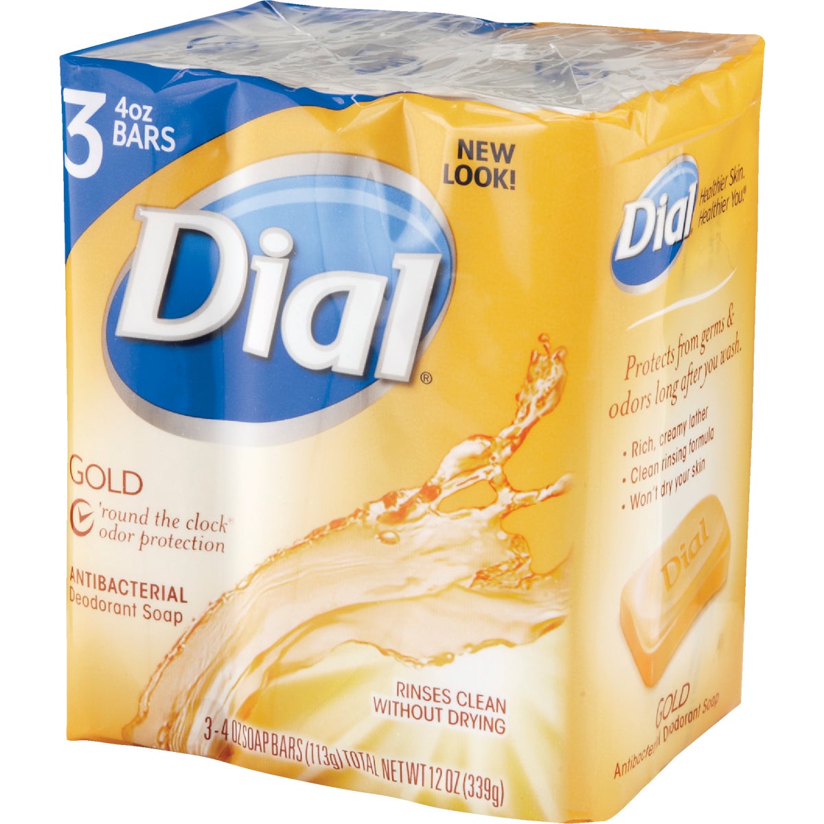 Dial Gold Bath Bar Soap packages 3 bars of soap with a size of 4.0 oz each. It is an antibacterial deodorant soap with around the clock odor protection.