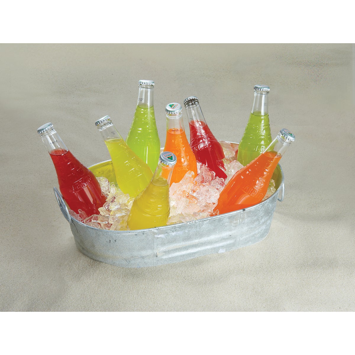 Hot-dipped steel construction. Designed for heavy-duty use. Side handles make it easy to move. Top is reinforced with high-strength wire. Corrugated bottom prevents rust. 30-gauge material.