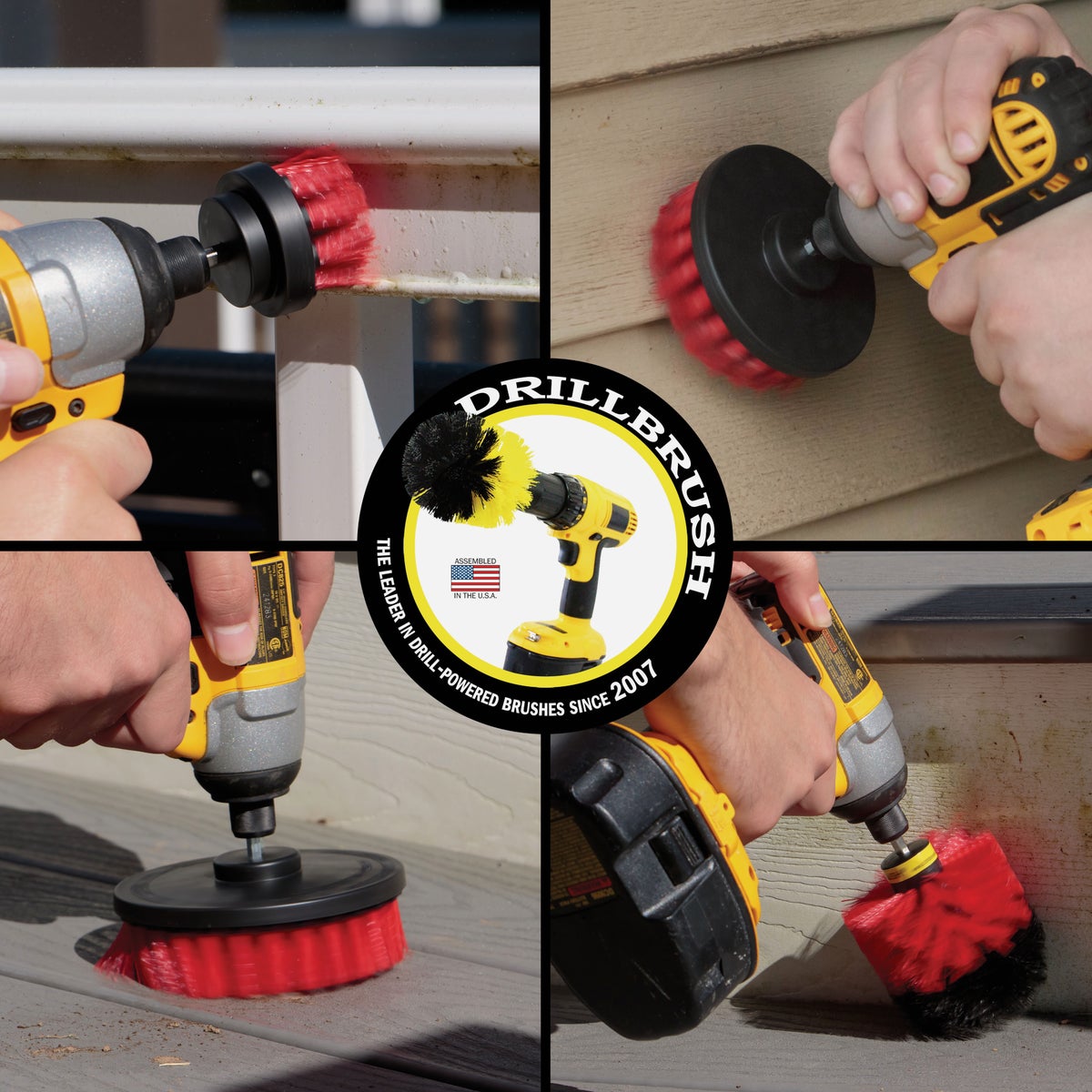 This four piece power brush kit contains an Original Drillbrush Power Scrubber in Stiff bristle Red and Black, a 2 In. detail brush, and a 4 In. and 5 In. flat red aggressive scrub brushes. The 2 In. brush is perfect for tight areas and corners. The 4 In. and 5 In. brush are for larger surfaces but are still easily maneuvered around contours. Stainless steel shaft fits in most cordless drills (drill not included). Durable construction, not available in retail stores. We also carry the largest line of drill powered brushes available for many applications. Perfect for lawn furniture, planters, picnic table, bench seats, swings, and outdoor woodwork.