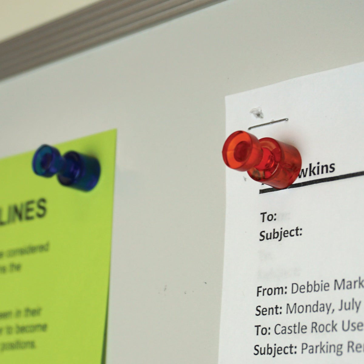 Push-pin shaped magnets keep notes, schedules, and reminders in plain sight. Use on any metal surface such as white boards, lockers, refrigerators, and more. Colorful, attractive, and fun. Made with Neodymium (Nd-Fe-B), the most powerful magnetic material in the world. Super holding power, despite their small size. Good in ambient temperatures up to 176 degrees F. Ideal for home, office, and school. Post memos, important reminders, drawings, and photos.