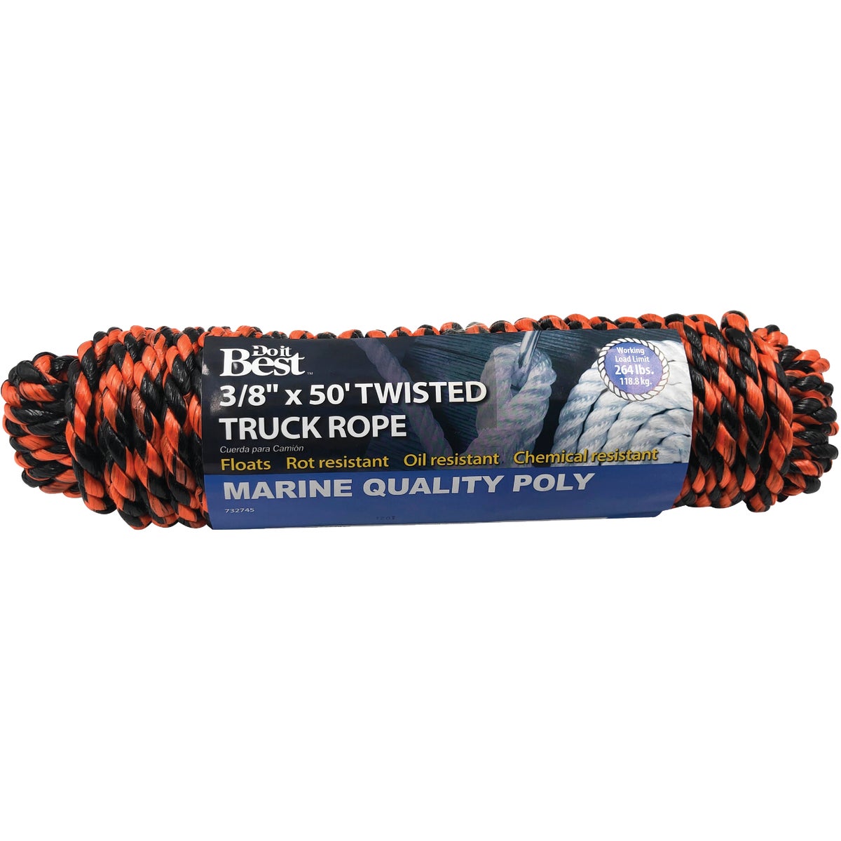 Superior strength polypropylene rope. Floats, which makes it ideal for using on boats and around water. Rot-resistant, oil-resistant, chemical-resistant, and abrasion-resistant. Durable and is long lasting, able to be reused. Ideal for a wide variety of indoor and outdoor applications. Orange yarn is used in rope for easy identification. 3/8 inches x 50 feet., working load limit: 264 pounds. Satisfaction guaranteed.