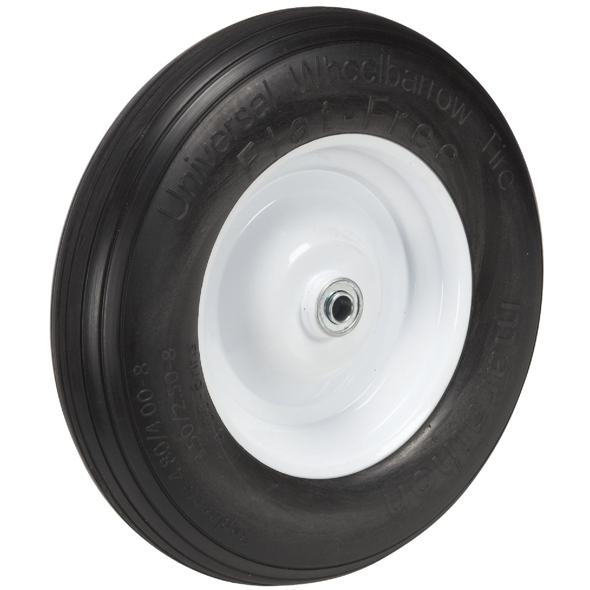 Universal fit polyurethane flat free wheelbarrow tire comes with a 3 In. hub and 5/8 in. bearings as well as a parts kit that includes: (4) 1/2 in. spacers, (2) 1 In. spacers and (2) 3/4 In. ball bearings allowing it to fit virtually every wheelbarrow. Easy-to-install with a minimal amount of tools required. Easy-to-read installation instructions on back of package. Tire fits 2-wheel wheelbarrows, lawnmower trailers, and garden carts. Replaces the following tire sizes: 4.80/4.00 x 8 In., 4.00 x 6 In., 4.00 x 8 In., and 3.50/2.50 x 8 In.