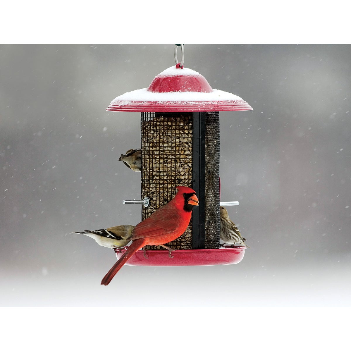 Twin dual-compartment screen feeder allows you to feed diverse birds from the same feeder. Features 2 seed compartments and differently-sized screen openings, allowing you to offer 2 seed types simultaneously to attract more birds. Includes a seed port, perch, screen, and tray with plenty of perching space, so multiple birds can feed in their most natural positions, whether clinging to the screen, perching, and even upside-down. The cover uses an easy screw-top design for convenient filling and cleaning. Built-in drainage holes help to keep seeds dry, while the seed diverter design keeps seeds moving into feeding areas. 3.3-pound seed capacity, speckled red powder-coated finish, and durable, all-metal construction.