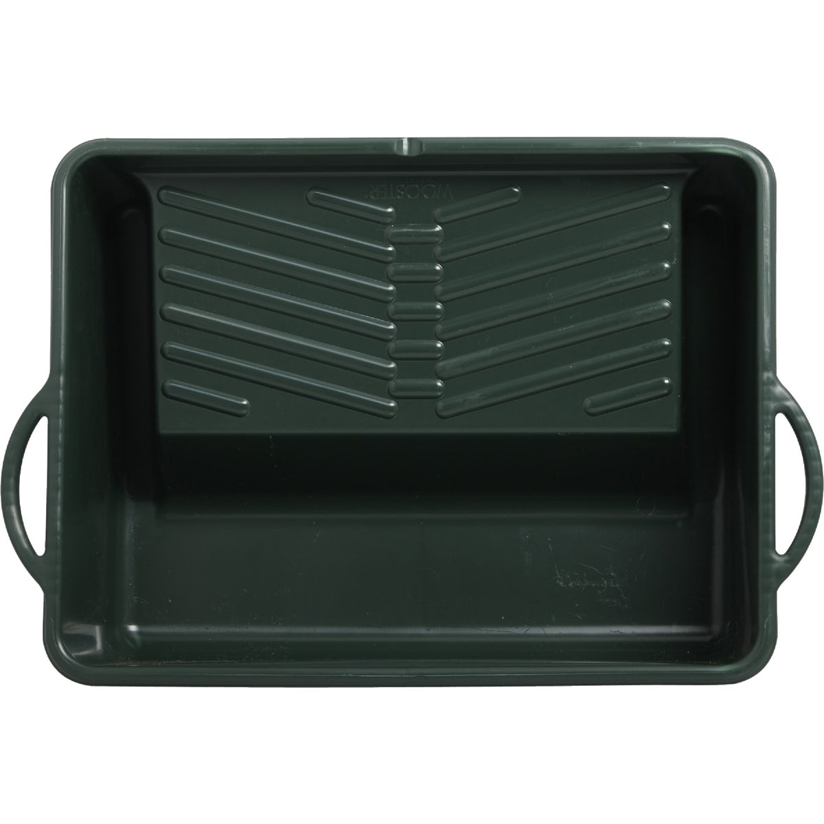 Hybrid of a tray and paint bucket, excellent for 14 In., 12 In., & 9 In. rollers. Built in 14 In. wide roll off grid and side handles for moving when filled. Durable green polypropylene resists solvents & paint build up. 18 In. W. x 14 In. L. x 7 In. D.