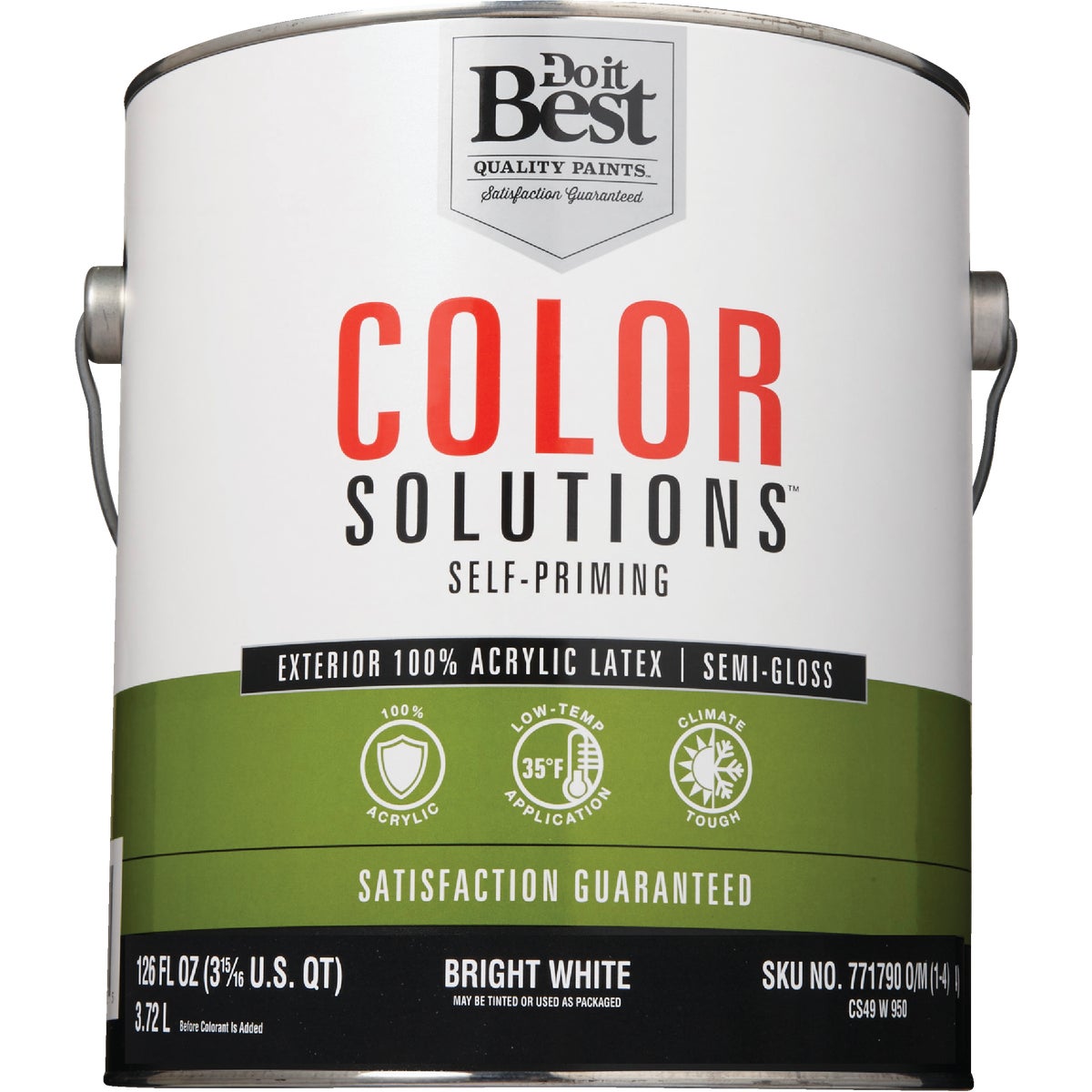 This paint is formulated with 100% acrylic resins for durability and color fast performance, use on most exterior building surfaces including wood, masonry, stucco, and metal. Tint bases can be mixed to over 1000 custom colors. Is resistant to fading, peeling, and blistering, and covers with 1 coat when applied over properly prepared surfaces. Covers approximately 400 Sq. Ft. per gallon. Recommend priming new wood with Do it Best latex or alkyd exterior wood primer. Dries to the touch in 2 Hrs., and to recoat in 4 to 6 Hrs. Apply with brush, paint pad, or sprayer. Easy to clean up with soap and water. Available in tint bases and packaged colors. Low temperature application down to 35 Deg. F. Satisfaction guaranteed.
