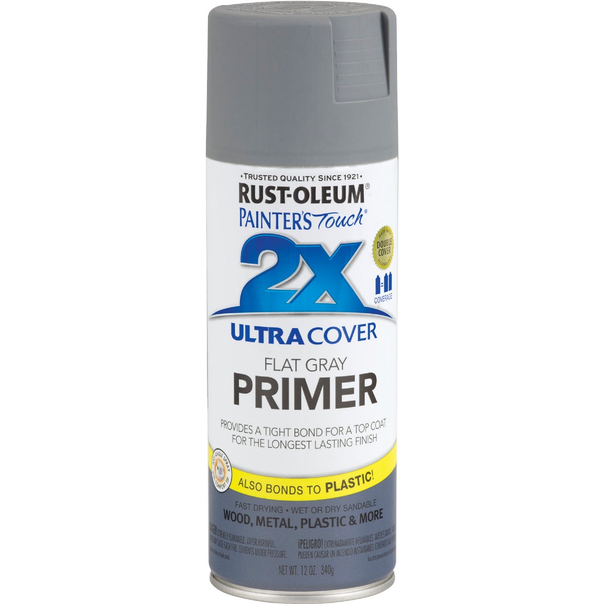 Rust-Oleum's Painter's Touch Ultra Cover 2X primer bonds with the topcoat to prevent chipping and peeling. It delivers twice the coverage as other competitive brands. The advanced double cover technology provides the best formula for ultimate hiding power, which allows projects to be completed faster and easier. Apply to wood, wicker, metal, plaster, or unglazed ceramic. Fast-dry formula. Product features: Ultimate coverage, smooth flat finish, any-angle spray with comfort spray tip. 12 fl. oz. can covers approximately 18 sq. ft.