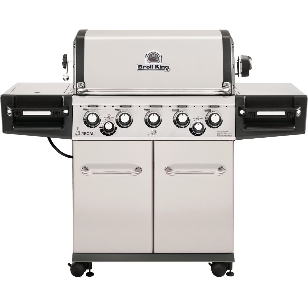 5-burner gas grill featuring 625 Sq. In. primary cooking area with 250 Sq. In. warming rack for a total of 875 Sq. In. cooking area. 55,000 BTU (British Thermal Unit) main burner, 10,000 BTU side burner, and 15,000 BTU stainless steel rear rotisserie burner and premium rotisserie kit. Features: 9mm rod stainless steel cooking grids and stainless steel Flav-R-Wave cooking system, 5 stainless steel Dual-Tube burners, stainless steel side shelves and cook box, stainless steel roll-action lid with cast aluminum end cap, enclosed cabinet base, illuminated control knobs, temperature gauge, and stainless steel electronic ignition switch. Limited lifetime warranty on cook box, 15 year comprehensive warranty.