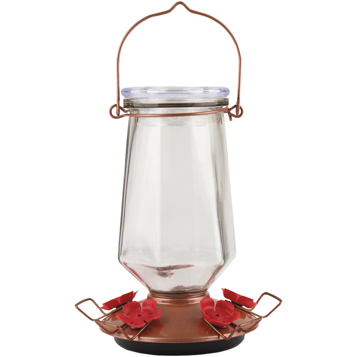 Crystal top-fill, glass hummingbird feeder features a wide-mouth opening and top-fill design to ensure that filling is always easy and mess-free. Simply remove the lid and pour 28 ounces of nectar into the wide-mouth opening to get your feeder up and running, there is no need to invert the bottle. Five hollyhock-inspired feeding ports are soft and flexible for a natural feel. The feeder is also easy to clean because it can be completely disassembled, ensuring that you can access every nook and cranny. Hummingbirds will not be able to resist the feeders life-like flower-shaped feeding ports.