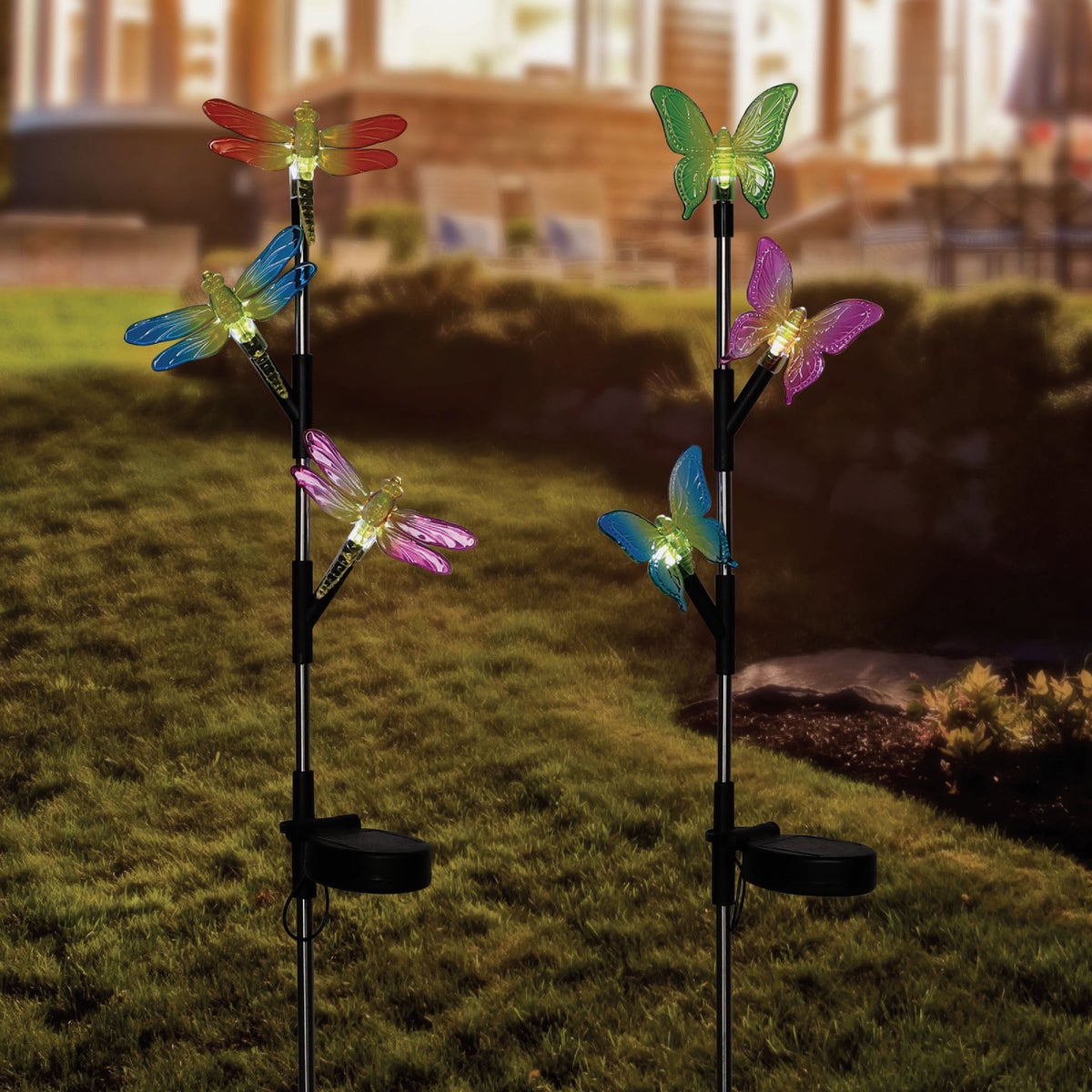 Solar triple insects LED (light emitting diode) garden stake. These realistically designed garden stakes are skillfully crafted with intricate life-like details illuminated by energy efficient solar powered cool white LED lights creating an elegant magical evening glow. Each stake has 3 delicate toppers replicating real life colorful insects that light up and add a sense of whimsy in your garden at night. The garden stake is made from durable sturdy materials made to withstand changing outdoor conditions for years of exterior use. Each of these lighted stakes measures 1 In. W. x 32 In. H. x 7 In. L.