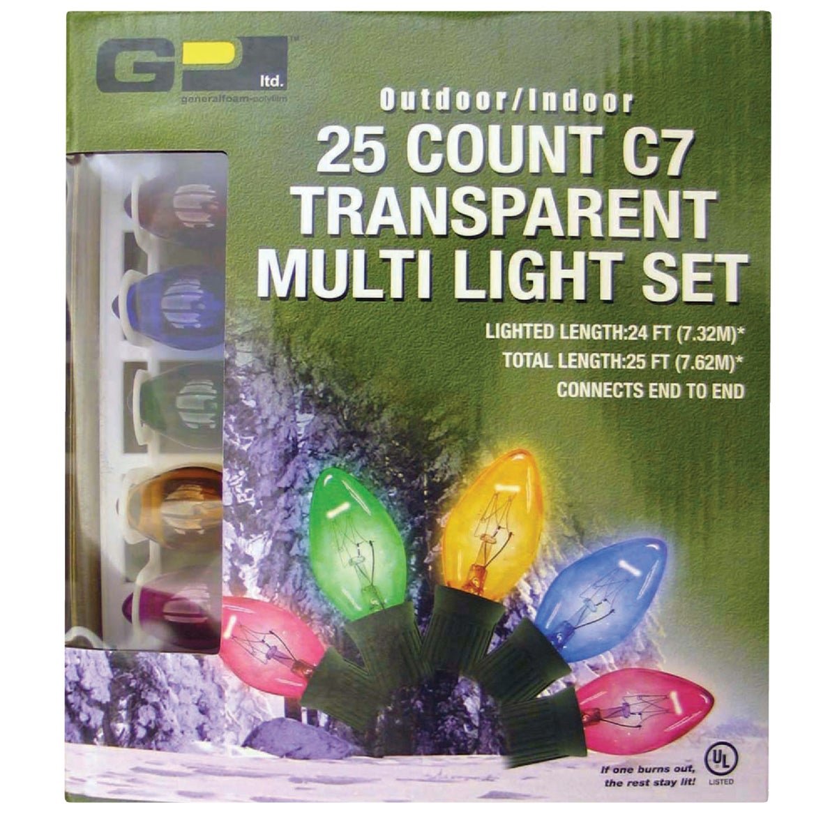 Incandescent holiday string light set. 25-light, C7 light set with green wire. Features 12-inch bulb spacing, 25.8-feet total length, and 25-feet lighted length. Ideal for indoor or outdoor use. 20-gauge wire with a 6-inch lead and 4-inch tail.