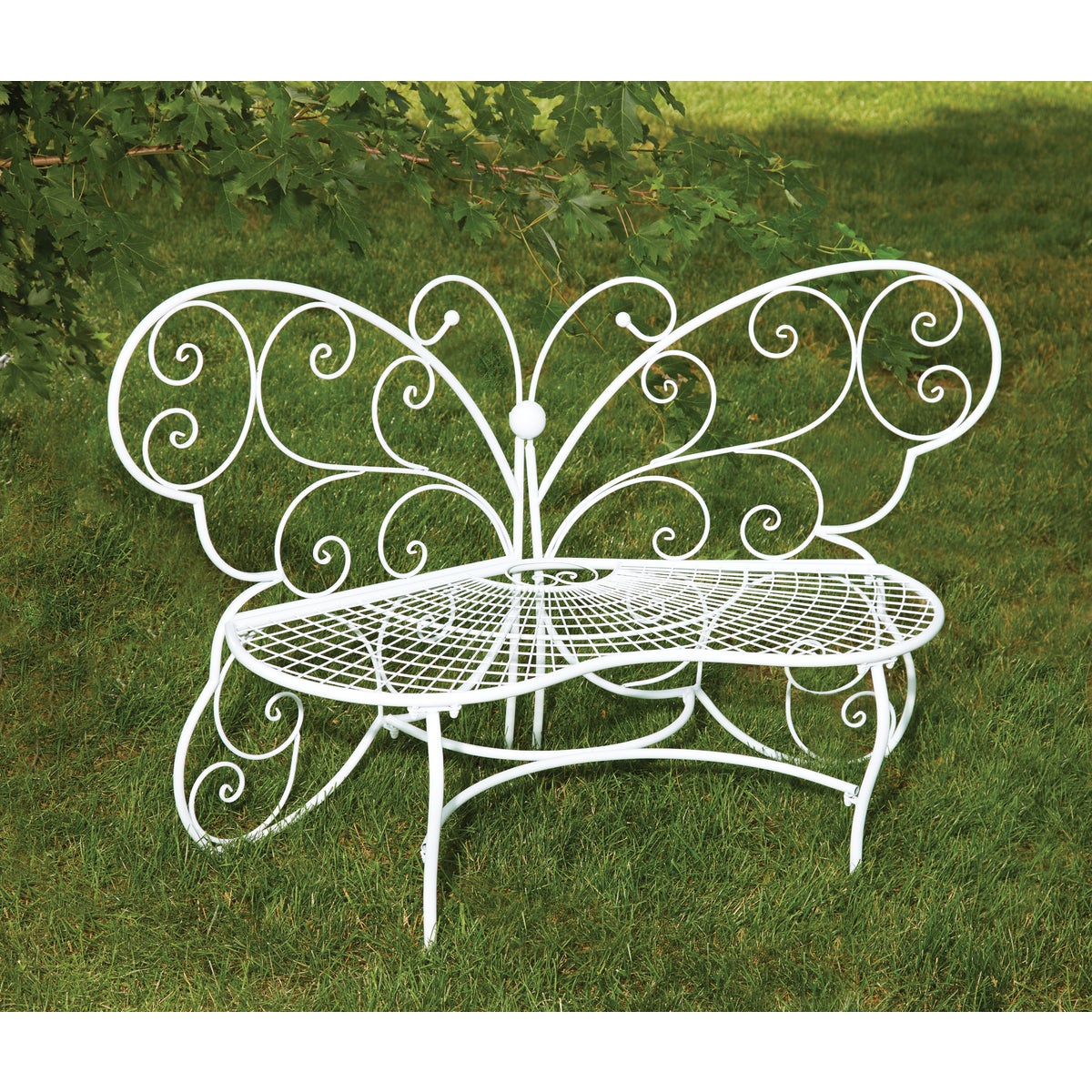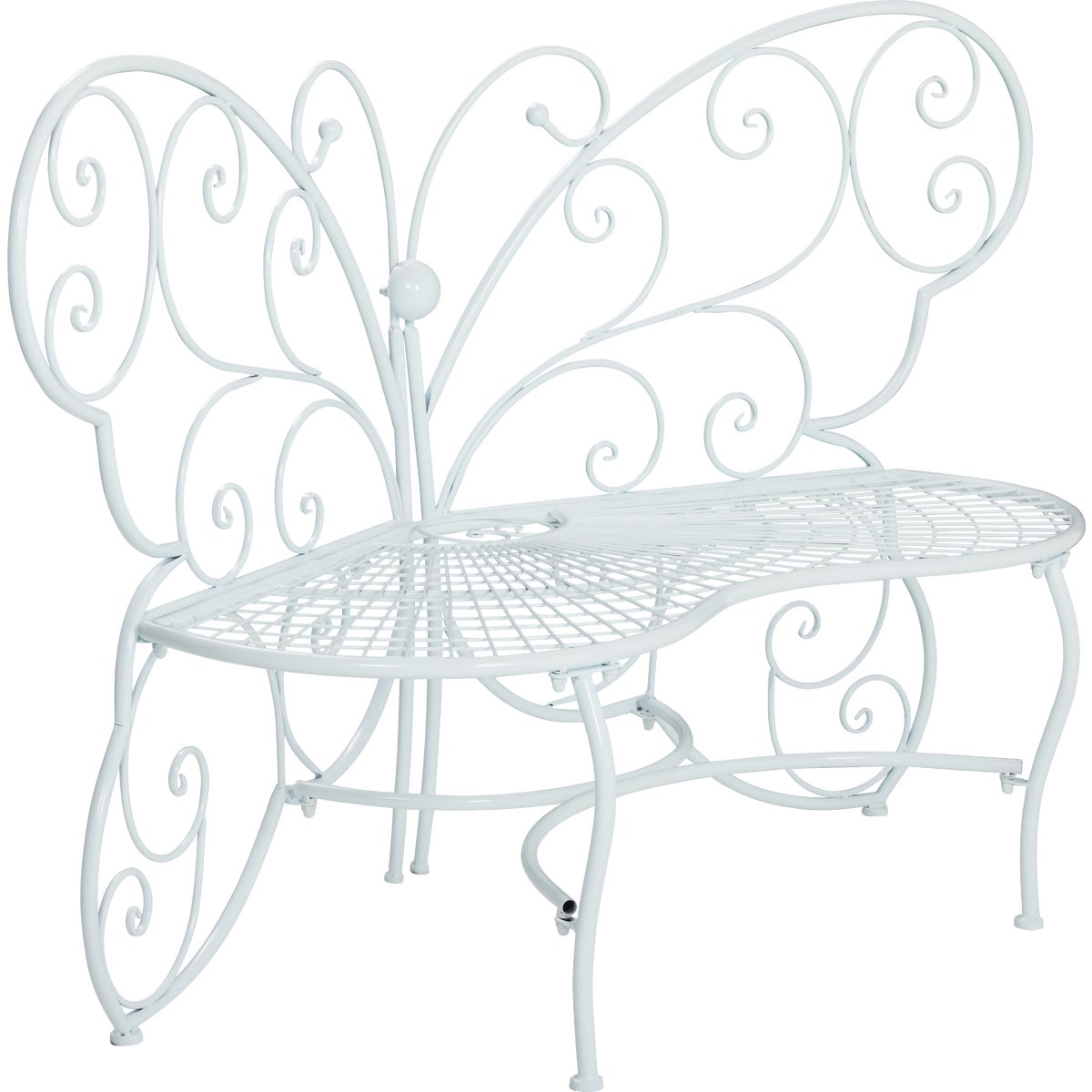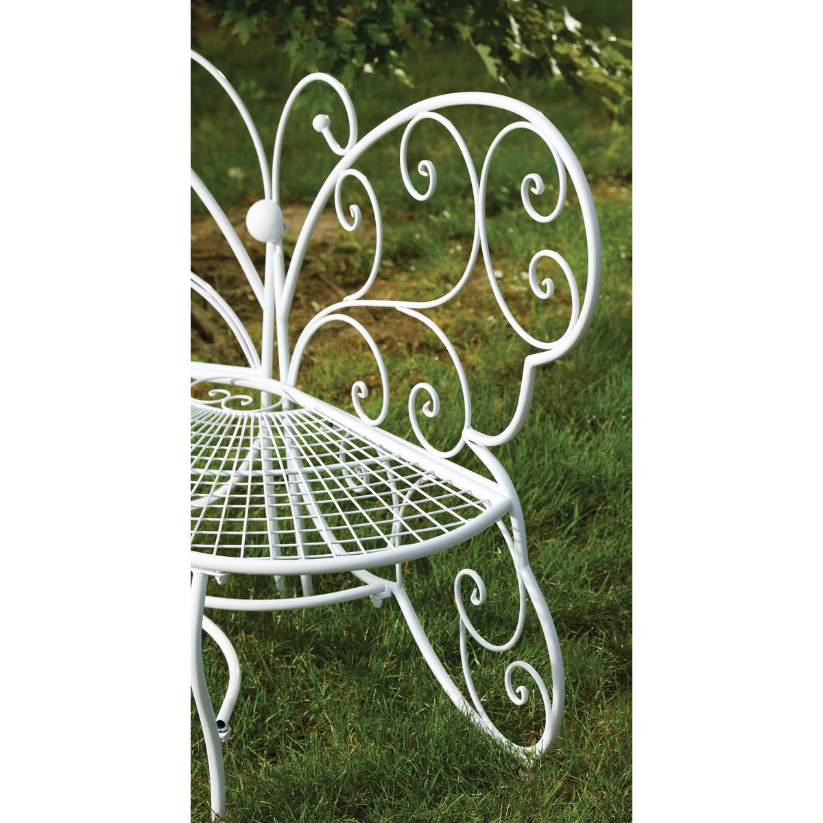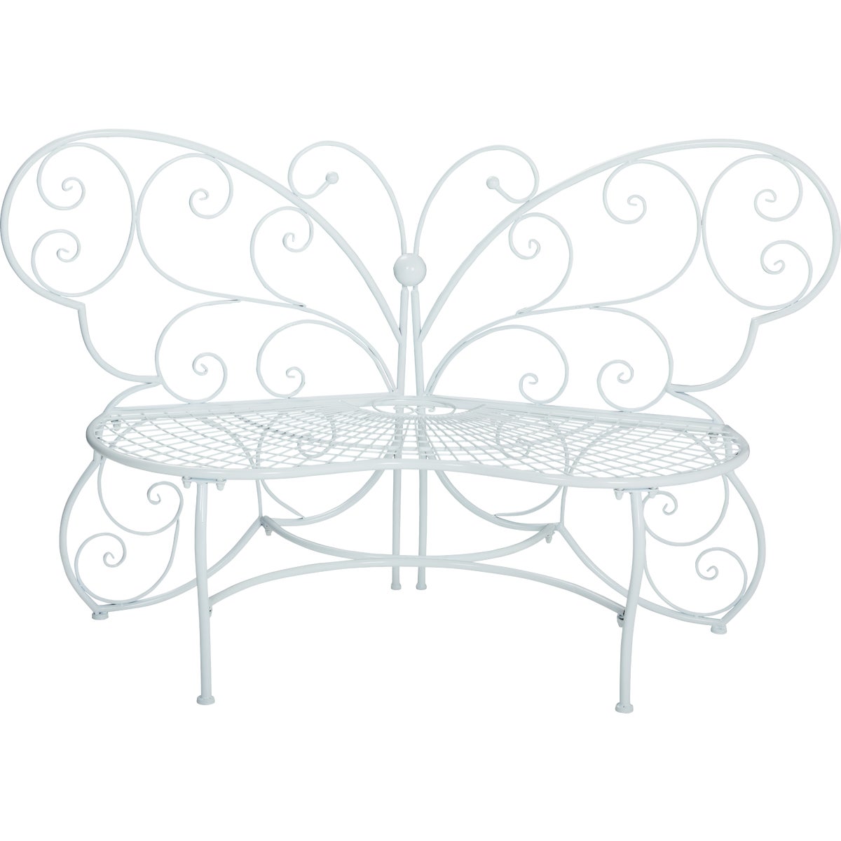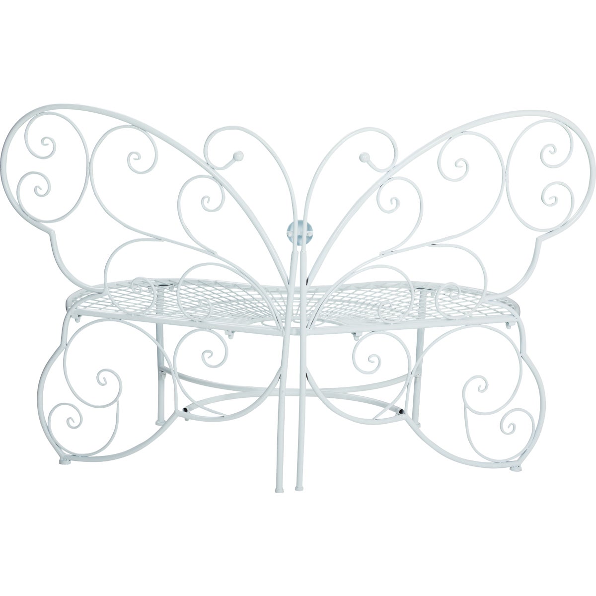 Indoor/outdoor 2-person, metal butterfly shaped garden bench. Compact design is perfect for adding a comfortable seat to your garden, backyard, or patio area for you and a friend. The durable, powder coated construction is built for all seasons. Features an open seat design, allowing rain and sprinkler water to flow through the bench so water does not pool. With a playful butterfly shape and intricate detail, this charming metal bench will add a pop of color and style to your outdoor living space, or it can also be used as a decorative accent indoors in your solarium or sunroom to display plants and decorative items. Relax and converse comfortably with friends for hours on this 2 seater indoor/outdoor bench with a high supportive back. Measures 26 In. W. x 38 In. H. x 62 In. L. Includes a one year manufacturer's warranty from date of purchase.