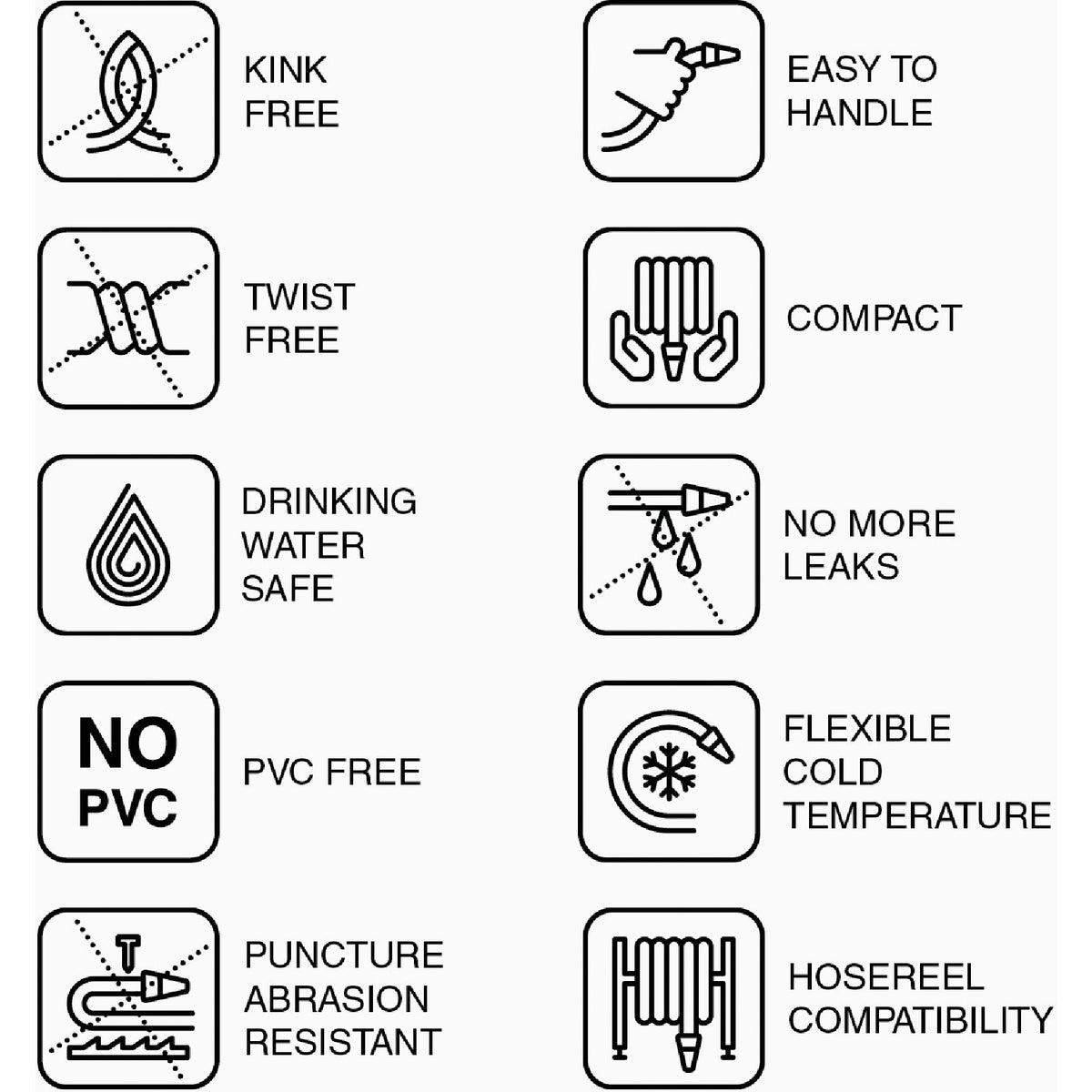 The Best Garden Hiflo garden hose is lightweight and compact. 2X lighter and 3X more compact than traditional garden hose. HDT outer layer makes the hose abrasion and puncture resistant. NTS mesh technology eliminates flow reduction due to kinks. No PVC, phthalates, or lead. Drinking water safe. Ultra-soft under layer for extremely easy handling and high flexibility ever at low temperatures. All season use, -40 degrees to 175 degrees. Aluminum crush-proof couplings. Strain relief collar. Flows 9 GPM. 10 year warranty.