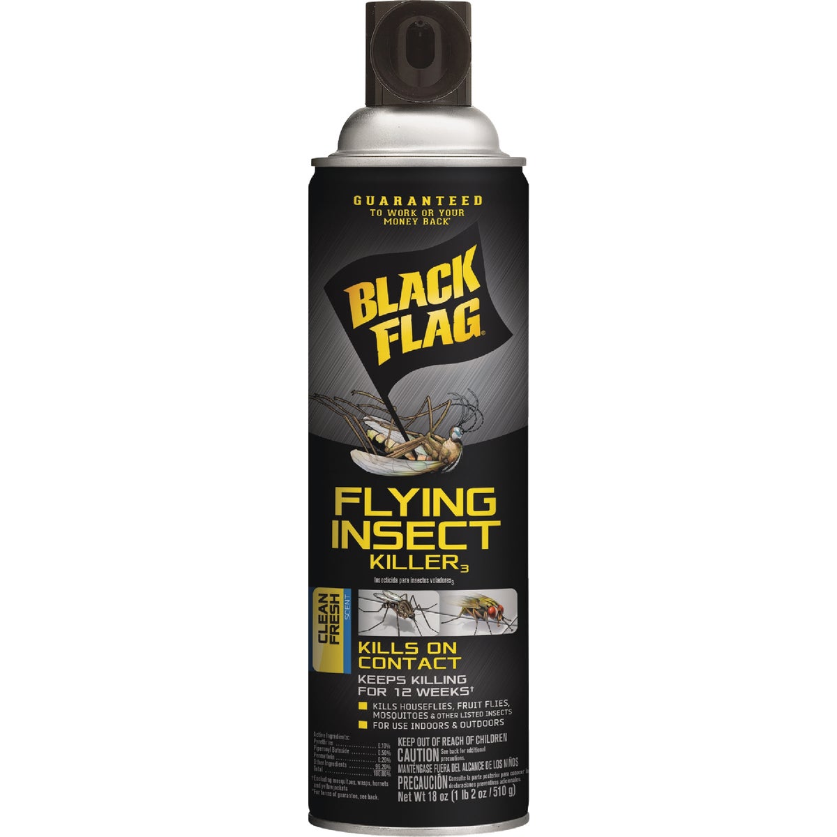 Black Flag Flying Insect Killer kills fast. It also kills bugs landing on treated surfaces for up to 12 weeks (excluding mosquitoes, wasps, hornets, and yellow jackets). This formula is effective against houseflies, fruit flies, mosquitoes, wasps, hornets, yellow jackets, gnats, skipper flies, and small flying moths. Can be used both indoors and outdoors. Contains a clean, fresh scent.