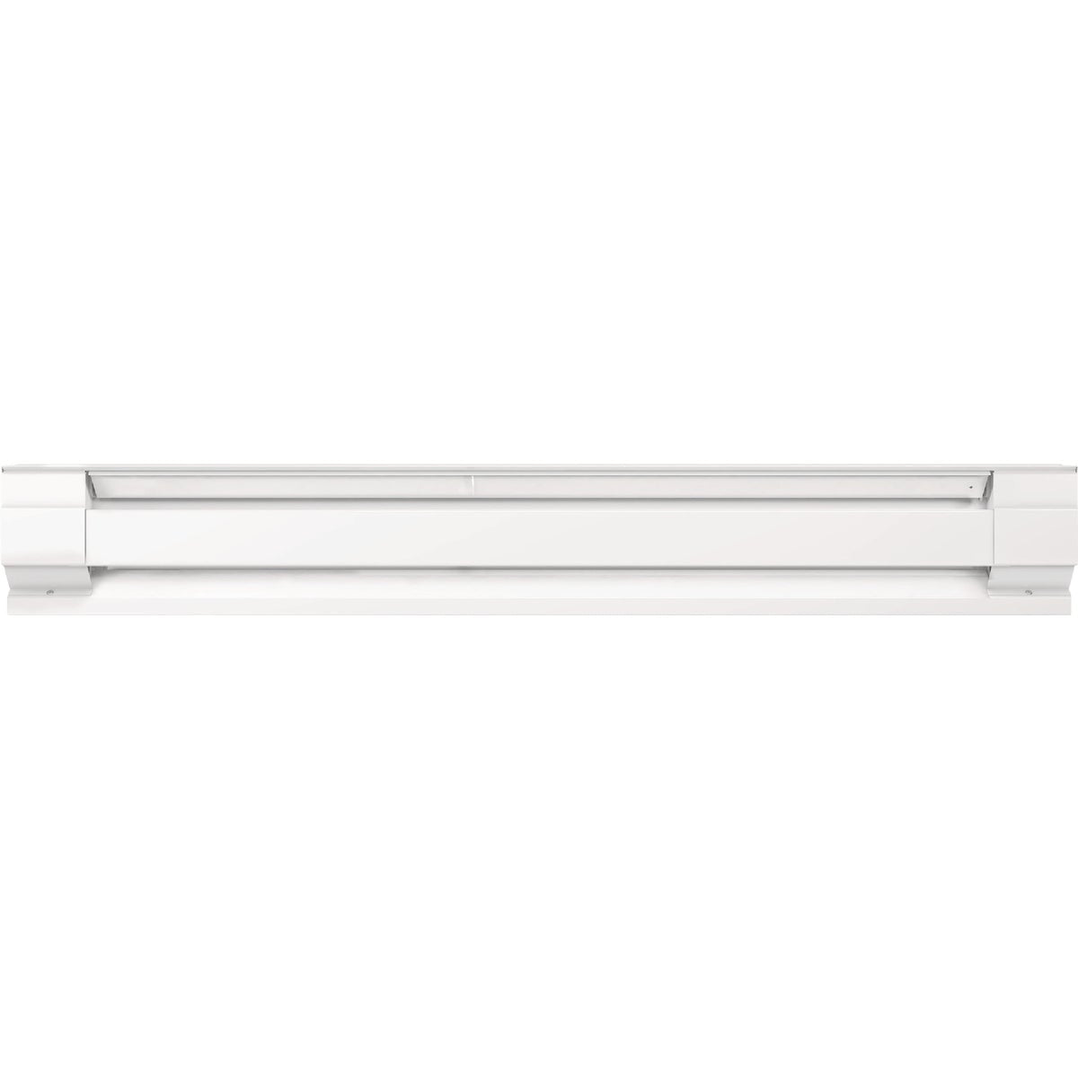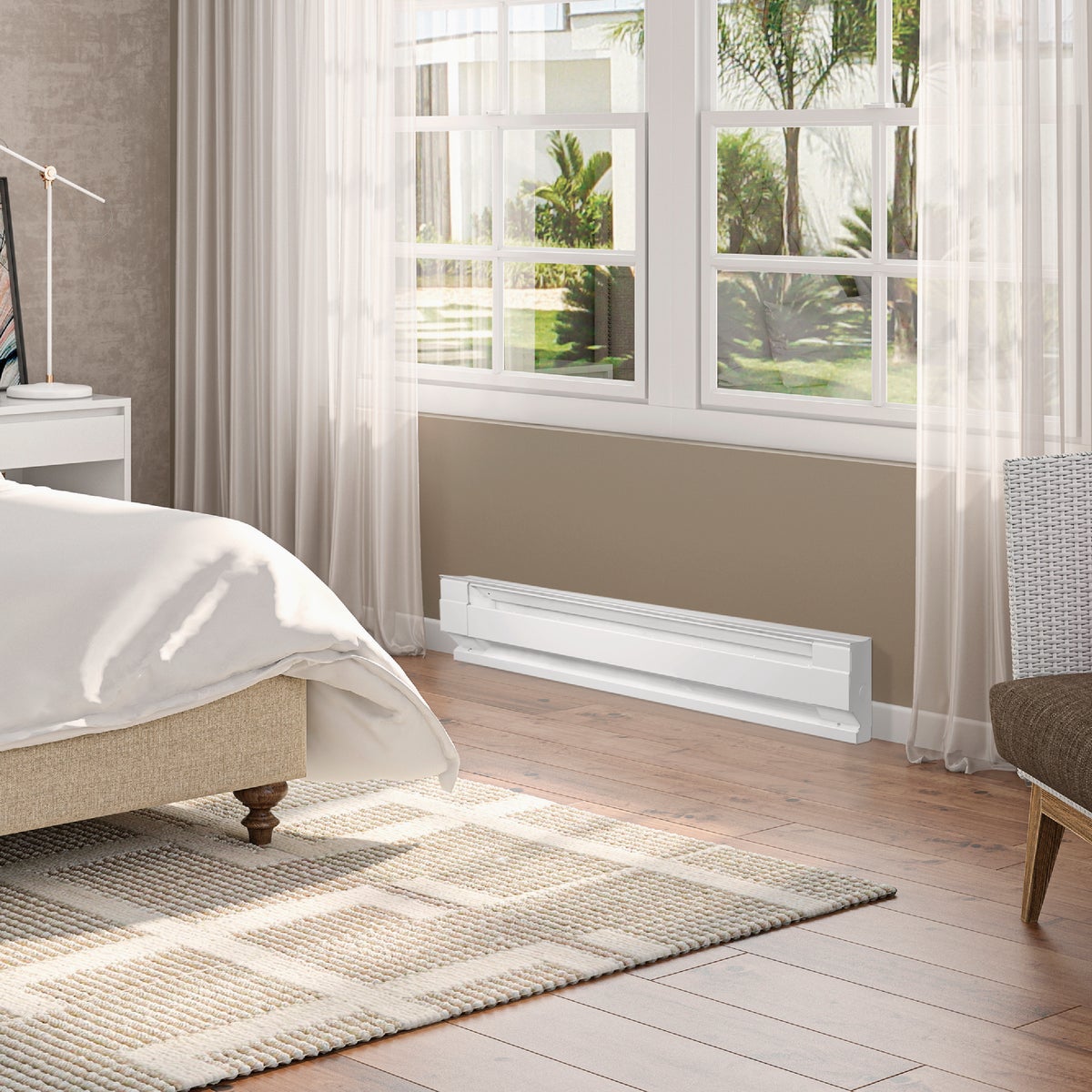 No plug required. Heater is hard-wired (possible from either end). Convection heater efficiently circulates warm air. Powder coating smooths sharp metal edges and provides a durable design. Includes a high-temperature safety shutoff feature to give you peace of mind. Case is pre-punched at one inch intervals and contains universal wiring to make installation easy. Best placement is under a window. Cool air enters from the window and is then heated by the baseboard, sending warmth circulating throughout the whole room. Heating element sheathed in steel to optimize heat transfer and offer added durability. Sized to industry standard lengths with contemporary baseboard design to make for easy, versatile replacement. Precisely control your temperature with either a wall thermostat or built-in thermostat (sold separately).
