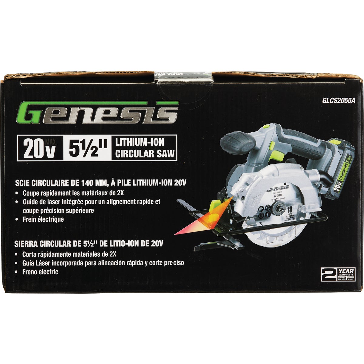 Genesis 20 Volt circular saw is perfect for home DIY projects. This 5-1/2 In. circular saw quickly cuts through 2X materials. Its lightweight 5.5 Lb. construction makes it easier to control with less user fatigue. This kit includes: (1) 18T carbide-tipped blade, rip guide, (1) 2.0 Ah lithium-ion battery, battery charger, and blade wrench.
