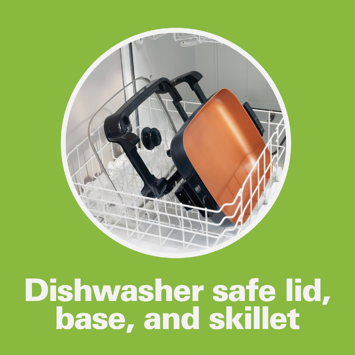Hamilton Beach Durathon Ceramic Skillet with Removable Pan Prepare easy, efficient one-dish meals with a nonstick countertop skillet. Enjoy the advantages of quick and even heating when you use the Hamilton Beach Durathon Ceramic Skillet with Removable Pan. Saute, fry, simmer or braise with efficiency and ease; the PTFE and PFOA free Durathon ceramic coating provides superior nonstick performance, no matter the recipe. The 12 x 15 cooking surface is four times more durable than traditional nonstick, so it won't crack or peel, and serving the meal straight from the pan is easy, since the skillet itself can be removed from the base and placed on a heatproof surface. The heat is adjustable for a range of cooking options, and the glass lid allows you to see the food as it cooks while keeping the heat locked in. After mealtime, once the cord has been removed, the skillet, lid and base can go in the dishwasher for easy cleanup. Enhanced Bullets: Simply lift off skillet pan for easy cleaning. The dial can be set to temperatures between 200-400F. Adjustable temperature control Glass lid included All parts are dishwasher safe with cord removed Key Features: Durathon Nonstick Coating The Durathon ceramic nonstick coating is four times more durable than traditional nonstick cooking surfaces, and wont crack or peel. You can easily fry on high heat or simmer on low. The warm setting is perfect for keeping food hot until dinner is ready or for the buffet line when you're entertaining. Hamilton Beach products are thoughtfully designed to make your life easier. We use consumer insights, in-depth research and rigorous testing to deliver the best solution to your everyday needs. Whether it's preparing delicious meals and beverages effortlessly, or making your clothes look their best, you can count on the brand that has spent over 100 years creating products with you in mind.