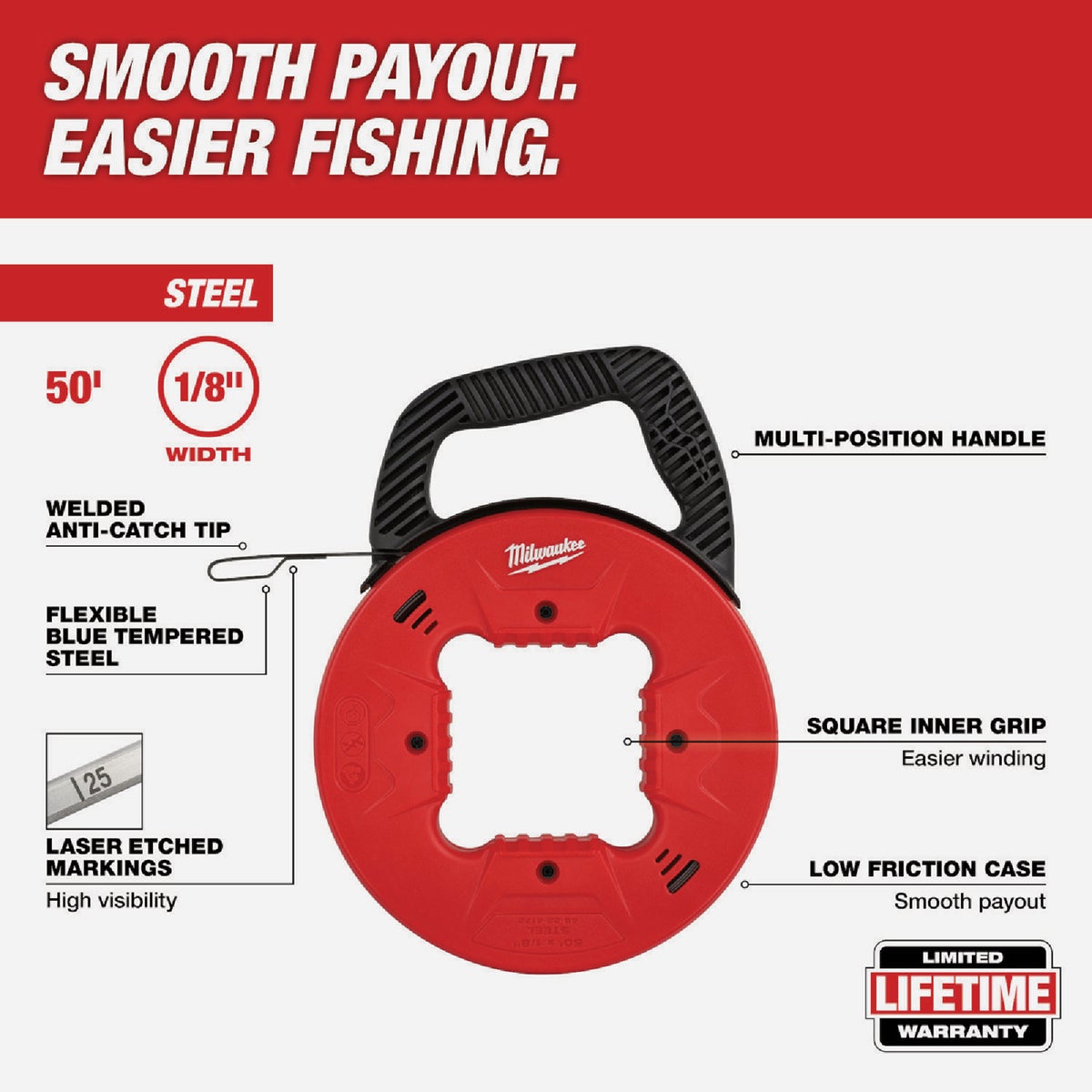 1/8-inch x 50-foot steel fish tape features a low friction case providing smooth payout and easy rewind. High-visibility laser etched markings on the tape accurately measure depth and position. The blue tempered steel balances strength and flexibility for easier fishing. The fish tape has a multi-position handle for comfortable fish tape use in any jobsite scenario.