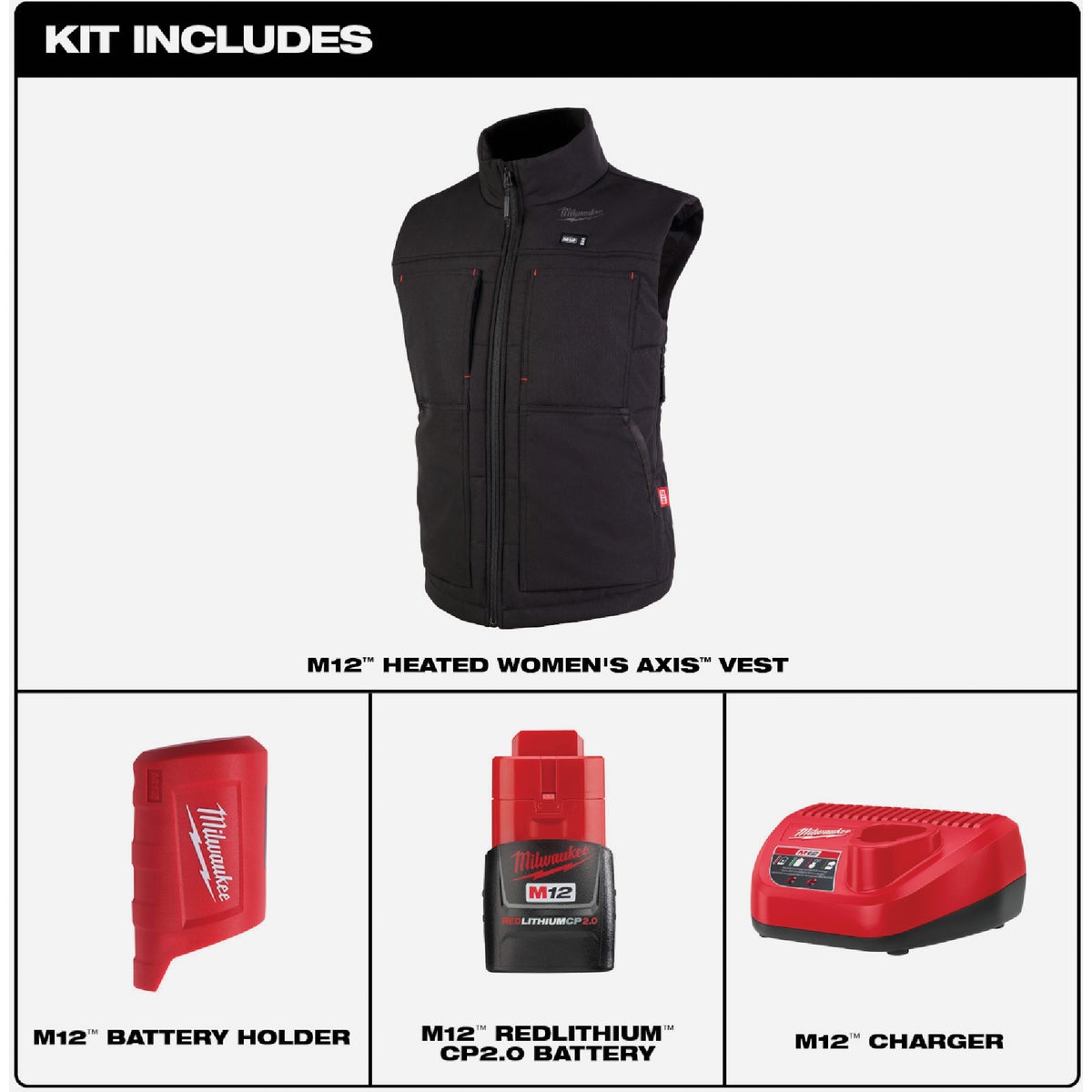 The Milwaukee M12 women's heated AXIS vest delivers heat built for lightweight durability. Powered by M12 REDLITHIUM battery technology, this lightweight and durable vest features an advanced heat technology system utilizing carbon fiber heating elements and Quick-Heat functionality, distributing heat 3X faster than market competitors to the chest and back. A hidden battery pass-thru pocket construction allows for front or back battery placement, increasing comfort and versatility. Five exterior pockets ensure your essentials are always within reach. With re-engineered AXIS Ripstop polyester fabric, our vest prevents tears from spreading while keeping heat in and not adding bulk. The compressible, wind and water-resistant design can be used as an outer shell or mid-layer vest depending on the situation. Includes the M12 heated AXIS vest, (1) M12 REDLITHIUM CP2.0 battery, (1) M12 battery charger, and (1) M12 battery holder.