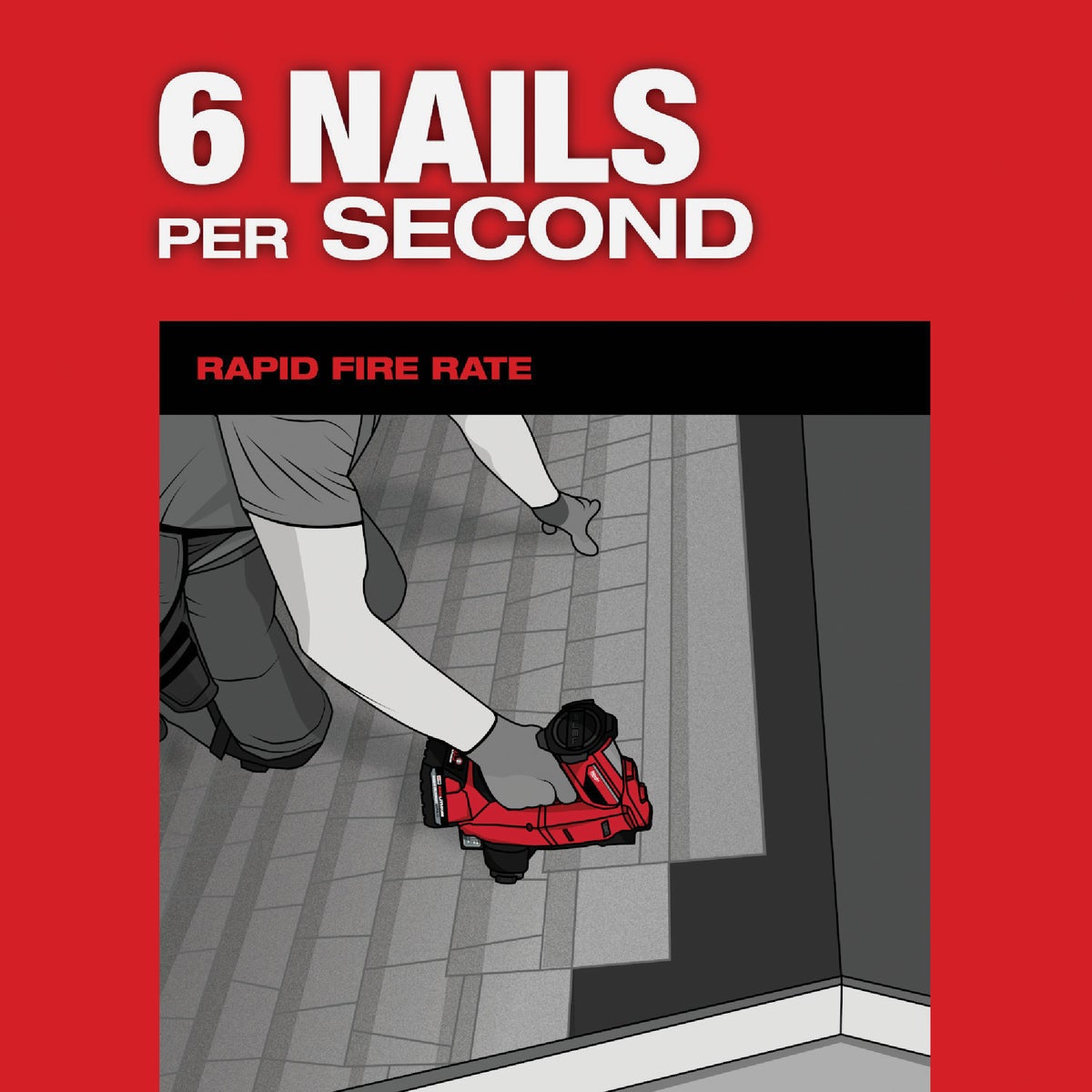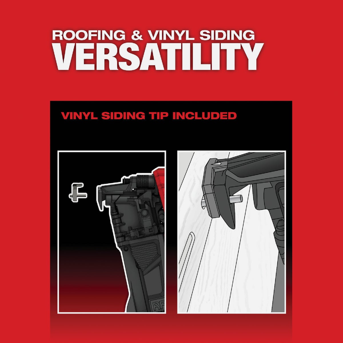 The MILWAUKEE M18 FUEL Coil Roofing Nailer delivers cordless innovation to Roofing and Exterior Contractors through optimized performance, best-in-class runtime, and unmatched versatility. This solution is designed for small roofing jobs and repairs along with the added versatility of vinyl siding installation. By leveraging our nitrogen air spring technology, POWERSTATE Brushless motor, and REDLINK Intelligence, this nailer delivers the performance to seat nails at firing rates of up to 6 nails per second. When paired with the M18 REDLITHIUM HIGH OUTPUT CP3.0 battery pack, this nailer sinks up to 1100 nails per charge, providing best-in-class runtime to maximize productivity. This tool features an attachable vinyl siding tip; increasing versatility to utilize the nailer for vinyl siding installation. The cordless roofing nailer features a pivoting belt/scaffolding hook, tool-free depth of drive adjustment, dry fire lockout, and replaceable rubber wear pads. The M18 FUEL Coil Roofing Nailer joins the M18 System of over 250 solutions and is compatible with all M18 REDLITHIUM batteries. Includes: M18 FUEL Coil Roofing Nailer, (1) M18 REDLITHIUM HIGH OUTPUT CP3.0 battery, (1) M18 & M12 Multi-Voltage Charger, and contractor bag.