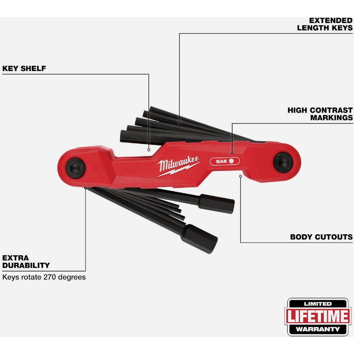 The Milwaukee 11-key electrician's folding hex key set features the easiest access keys on the market. The access zones on the handle and a key shelf to elevate the keys for quick access and selection. The handle has long-lasting, high-contrast markings to help find the right size key. The shape of the handle is optimized for comfort and the extended-length keys rotate 270 degrees for greater access and torque in tight spaces. Includes 11 SAE keys: 3/32 In., 7/64 In., 1/8 In., 9/64 In., 5/32 In., 3/16 In., 7/32 In., 1/4 In., 5/16 In., 3/8 In., 1/2 In. The convenient folding hex key set makes transportation and storage simple. Backed by the Milwaukee limited lifetime warranty.