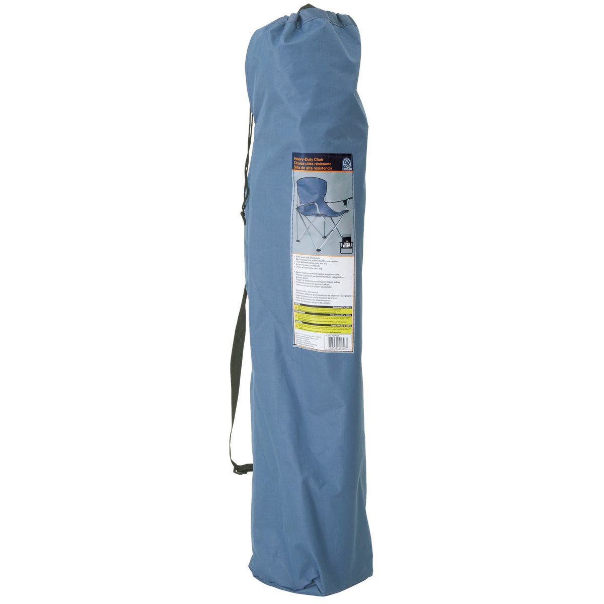 Heavy-duty quad chair. Sturdy steel frame construction supports up to 500 pounds. Oversized seat and back gives extra comfort and stability. Opens and folds in seconds, easy to use and store. Fabric bag with carry strap included. Stain and moisture resistant. Features 600 x 300D polyester fabric with PE coating. 2 fabric oversize cup holders. Open dimensions: 35 In. W. x 23.5 In. H. x 38 In. D. Closed dimensions: 21.75 In. W. x 3.5 In. H. x 26 In. D.