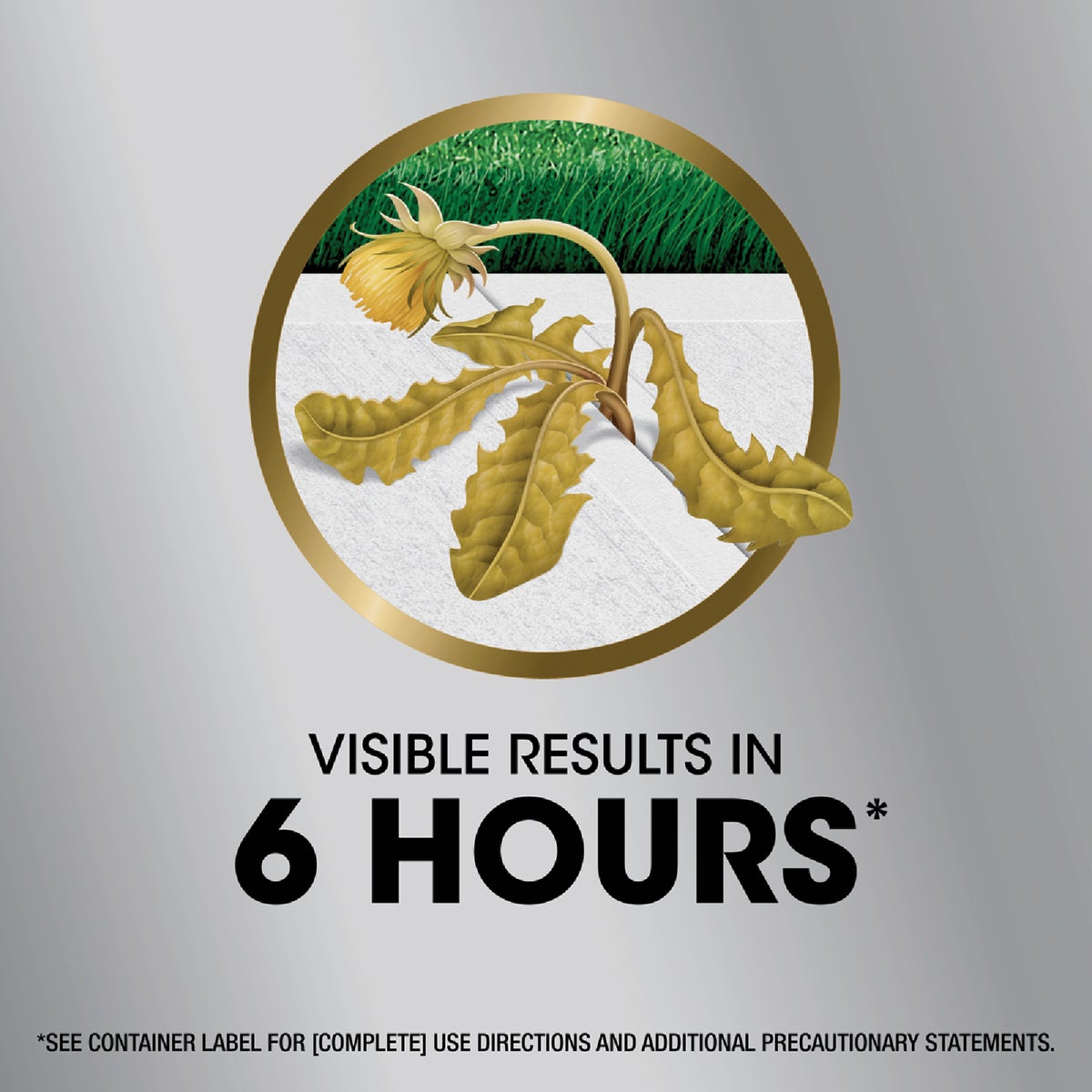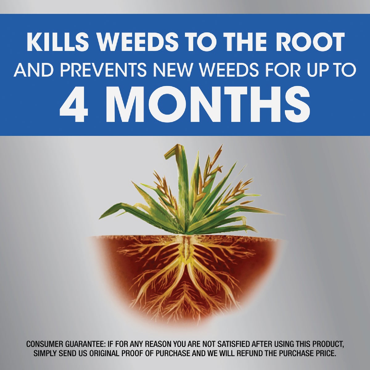 Dual action formula that kills existing weeds and grasses down to the root. Prevents new weeds from growing for up to 4 months by creating an invisible barrier in the soil. Ideal to use on driveways, sidewalks, patios, around trees, landscaping areas, along fences, and gravel areas. For best results, apply during warm, sunny weather above 60 degrees Fahrenheit. Rainproof in 30 minutes. Visible results in 6 hours.