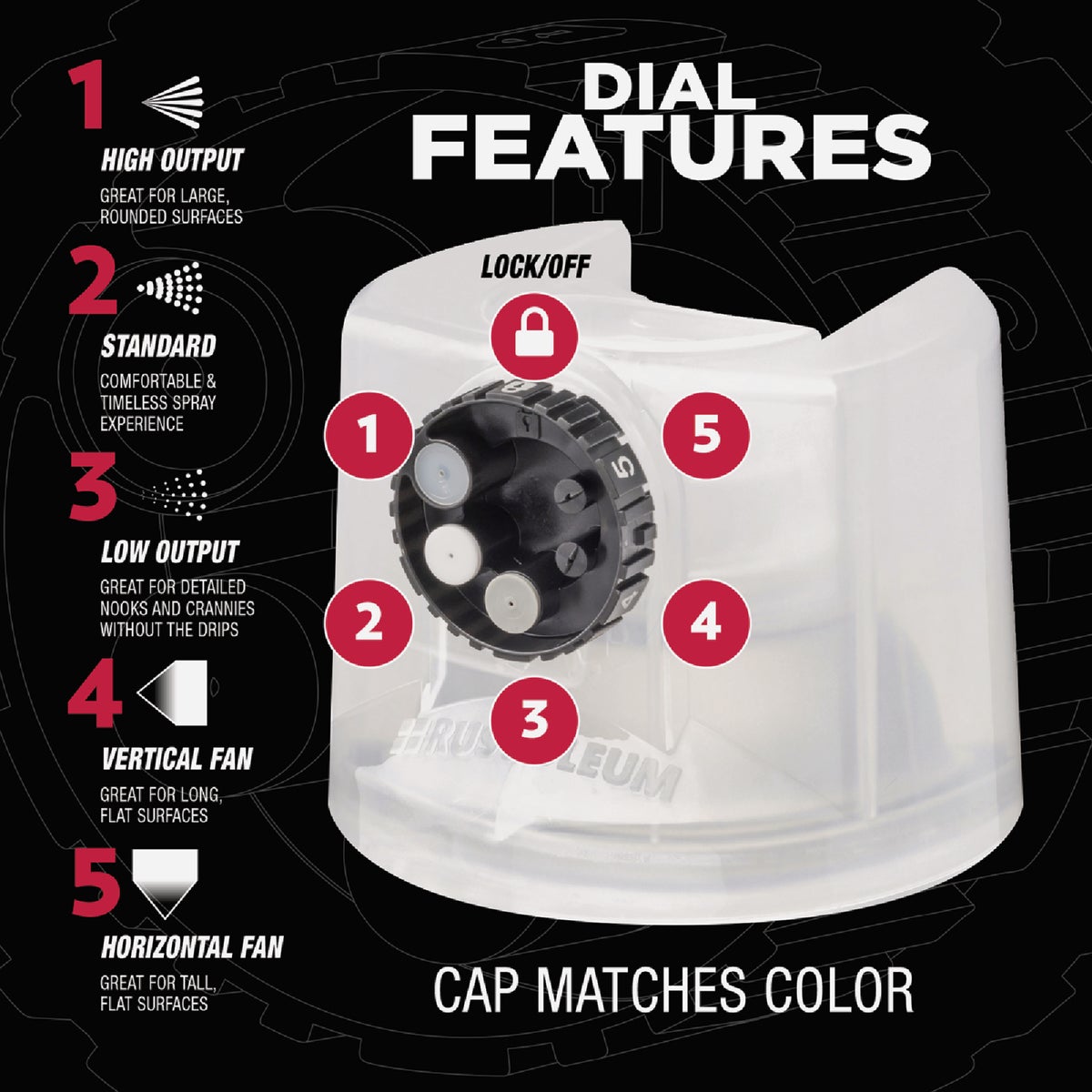 Rust-Oleum Stops Rust Protective Enamel Spray Paint with Custom Spray 5-in-1 features five different spray patterns for ultimate control. High output spray for large curved surfaces, standard for a traditional spray pattern, low output for painting curves and edges without runs or drips, vertical fan for wide surfaces and horizontal fan for tall surfaces. This fast dry, oil-based coating provides outstanding protection from rust, corrosion, fading, chipping and other abrasions. For use on interior and exterior metal/wood projects.
