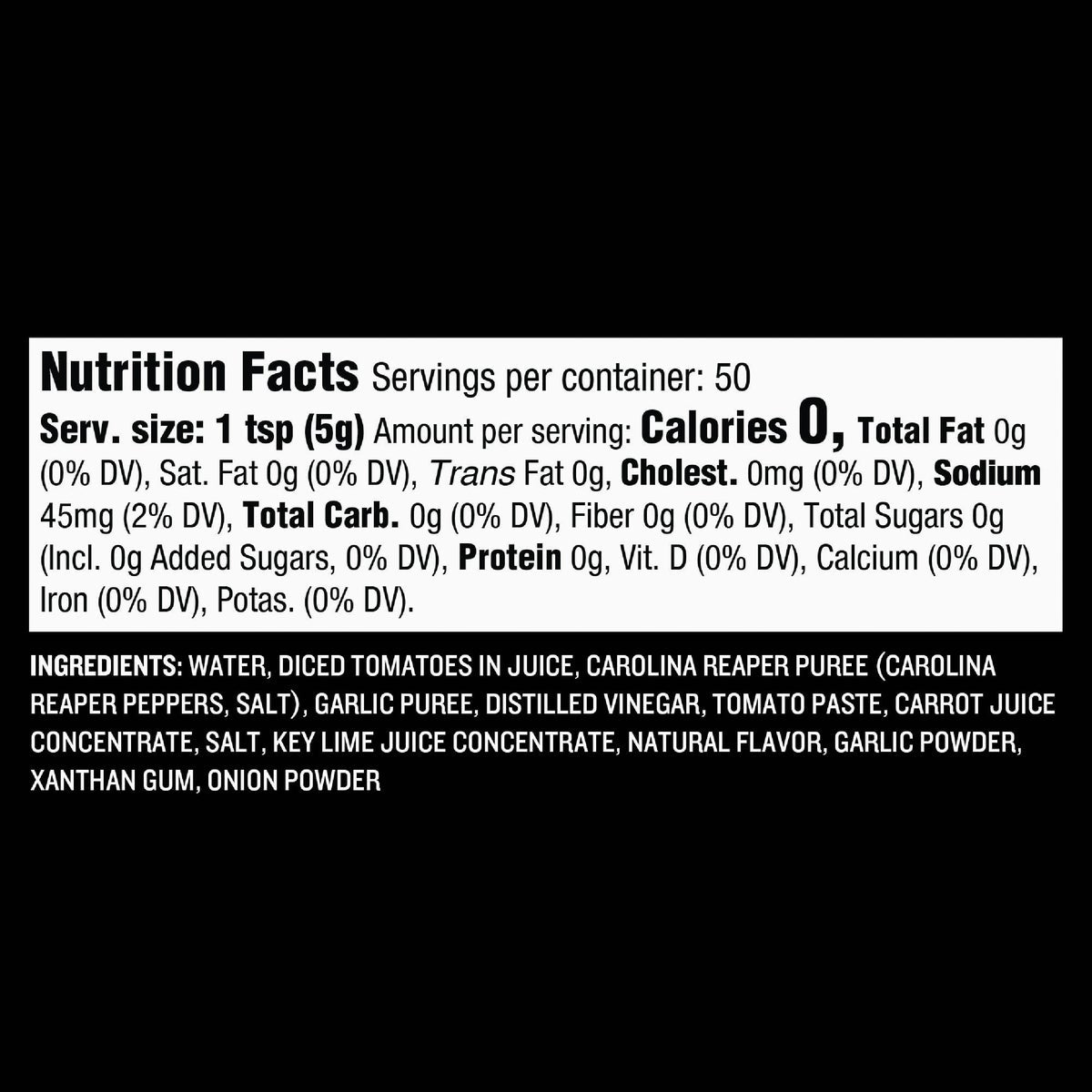 Splash this tongue-scorching sauce on your food to take your tastebuds on a fiery ride if you dare. It features devilishly hot Carolina Reaper peppers blended with garlic for bold, super-spicy flavor that could wake the dead.