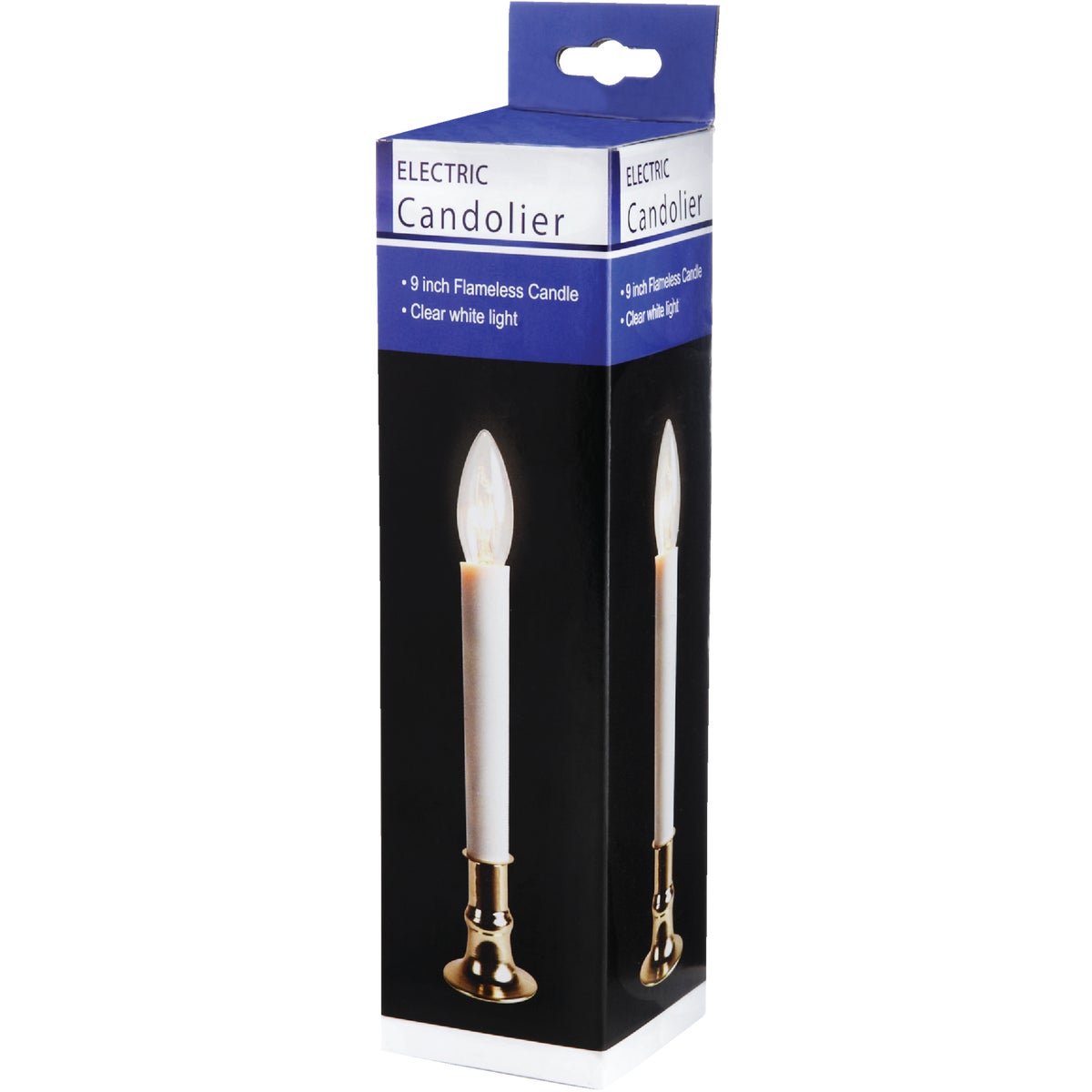 Brass colored plastic base electric candle with On/Off switch and 60 inch cord.