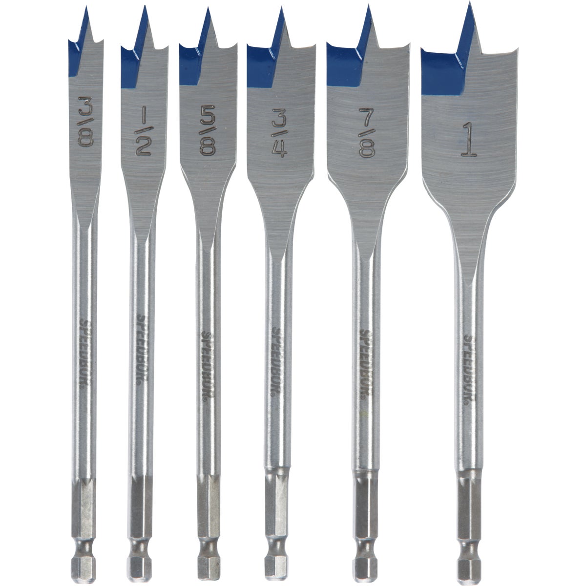Blue-Groove point and cutting edge for faster chip removal. Double cutting spurs scribe the outside of the hole reducing breakout. 10% larger shank for added durability. Grooved hex shank prevents slipping in drill chuck or bit extension. Bit identification is simple with easy-to-read size markings. Standard length. Includes sizes: 3/8", 1/2", 5/8", 3/4", 7/8", and 1".