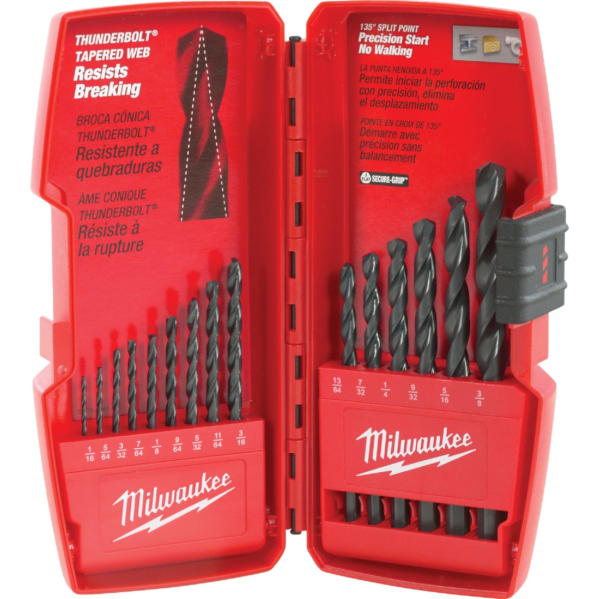 These jobber length drill bits are designed for extreme durability and long life. The Thunderbolt web features a thicker core than a standard drill bit, which provides ultimate strength and protects against side-load breakage. A specially designed parabollic flute form clears chips and debris fast to keep the bit cool. A precision start, 135 split point tip starts on contact to keep the bit from walking for fast accurate holes. Excellent for drilling on curved surfaces, requires less effort to drill, and is highly recommended for use with portable drills. The 3-flat secure-grip shank won't slip in the drill chuck. Reduced shank diameter for use in 3/8" chucks. Includes the following bits: 1/16", 5/64", 3/32", 7/64", 1/8", 9/64", 5/32", 11/64", 3/16", 13/64", 7/32", 1/4", 9/32", 5/16", and 3/8".