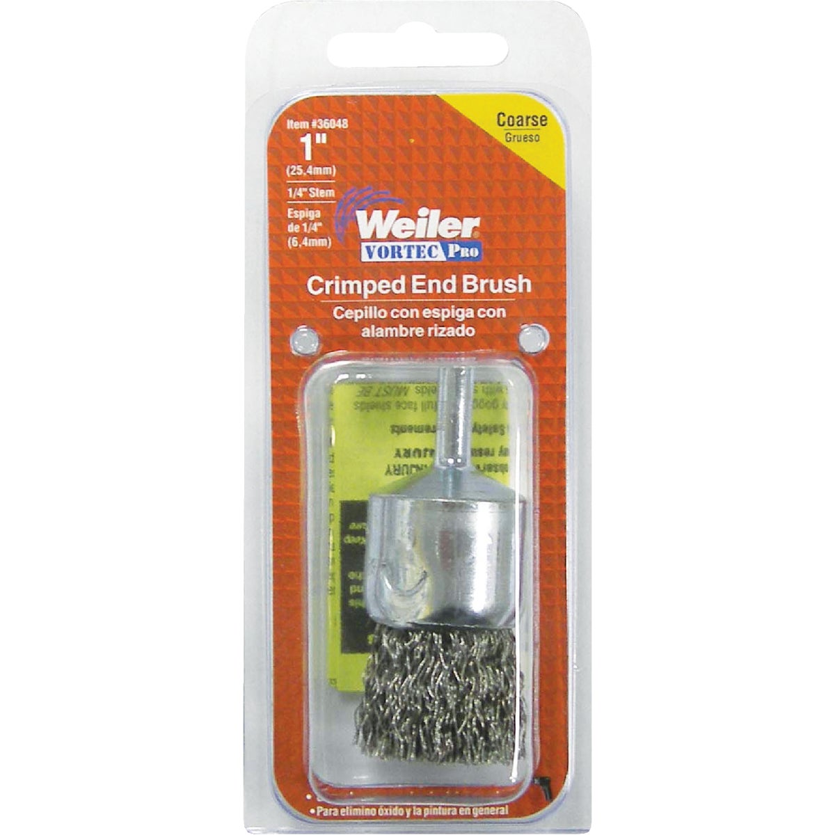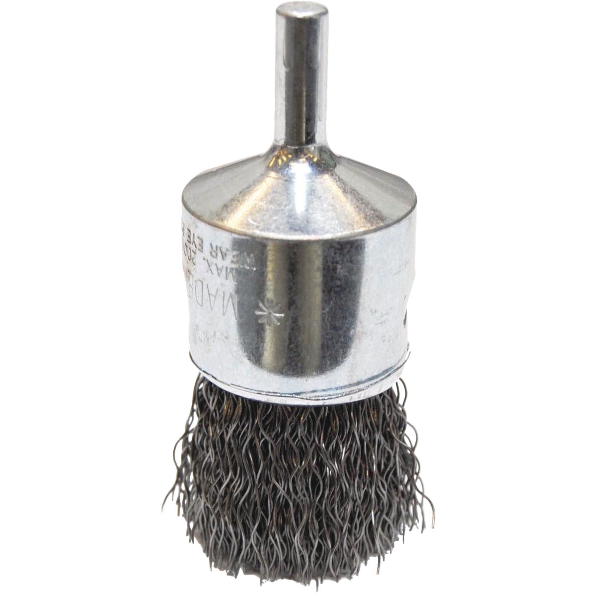 Professional shank-mounted brush. 1/4" shank mounts on drill for power brushing applications in hard-to-reach areas. Coarse wire for rust and paint removal, pipe cleaning, and spot facing. Wire size: .020". Maximum speed 22,000 RPM. Carded.