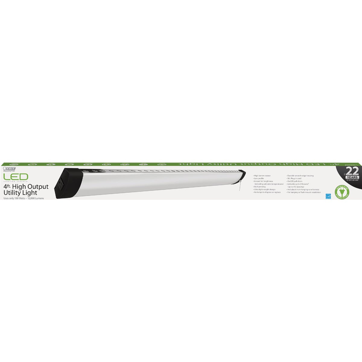 High-lumen LED (light emitting diode) utility light comes fully assembled and provides added brightness to any residential or commercial area. Perfect for either hanging or flush mount installation, this fixture outputs a super bright 12,000 lumen of 5000K daylight color temperature light. Features lightweight, durable smooth edge housing, and a low profile design. Includes (1) 5-foot plug-in cord and (2) 6-inch hanging wire harnesses. Link up to 3 fixtures for more flexible coverage. No humming and instant full brightness (including in sub-zero temperatures). Maintenance free design with no bulbs to replace. 50,000 hours rated life. Energy Star certified.