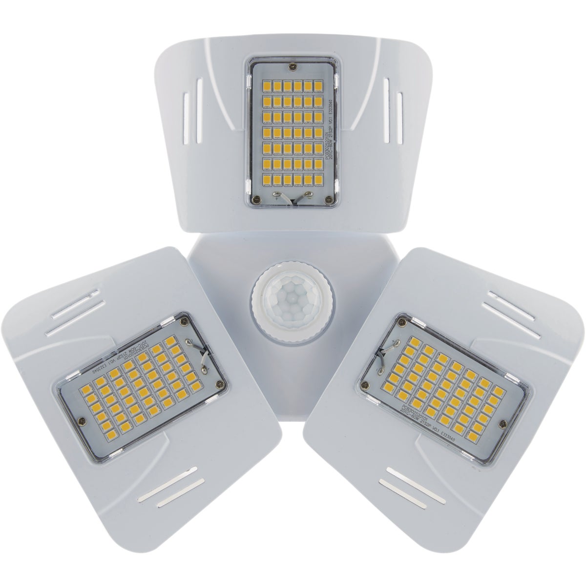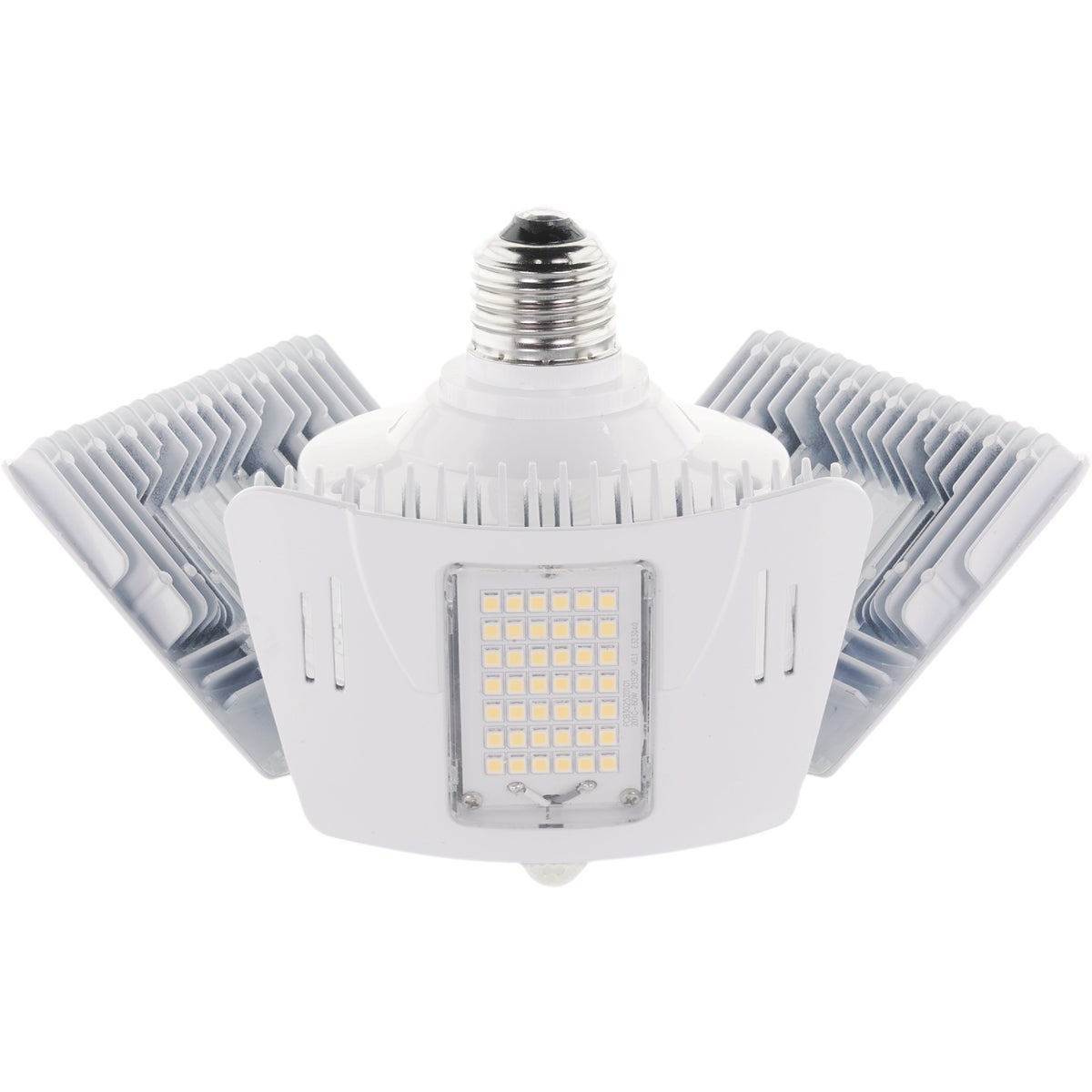 60-watt LED (light emitting diode) multi-beam utility light replaces high-wattage HID CFL (compact fluorescent) and incandescent lamps, but uses only 60 watts. Compatible with a standard medium (E26) light socket. Features a built-in motion sensor. The high-lumen LED light panels adjust to 135 degrees and a full 180 degrees. The rugged construction makes it perfectly suited for use in garages, barns, workshops, sheds, utility rooms, and other large, open spaces. Long life: 50,000 hours. cUL listed for damp locations. 3-year warranty.