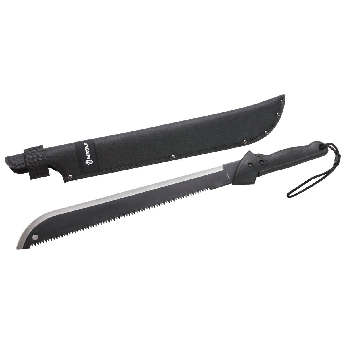 The Gator Machete wields an 18 In. fine edge blade on 1 side, an 18 In. high performance saw blade on the other, and Gerber proprietary Gator rubber grip for ergonomic control while using either. The riveted nylon sheath provides safe, durable transport. Carded.