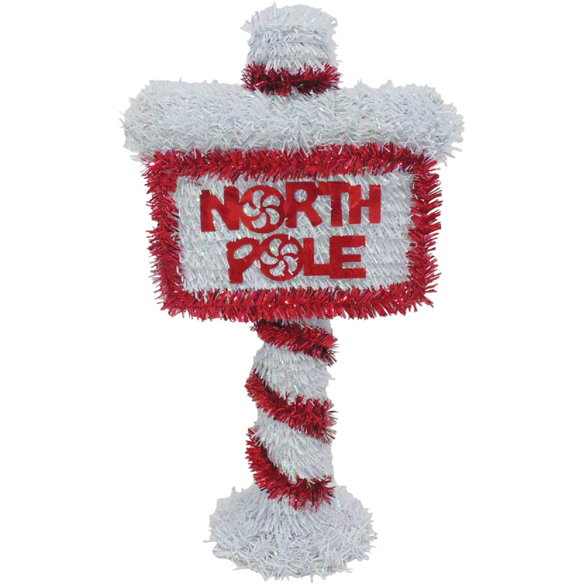 3-dimensional tinsel North Pole sign with red and opal trim. Ideal for table top decoration and other applications. Adds a festive touch to any holiday decorating style. 8 In. W. x 14 In. H. x 4.25 In. D.
