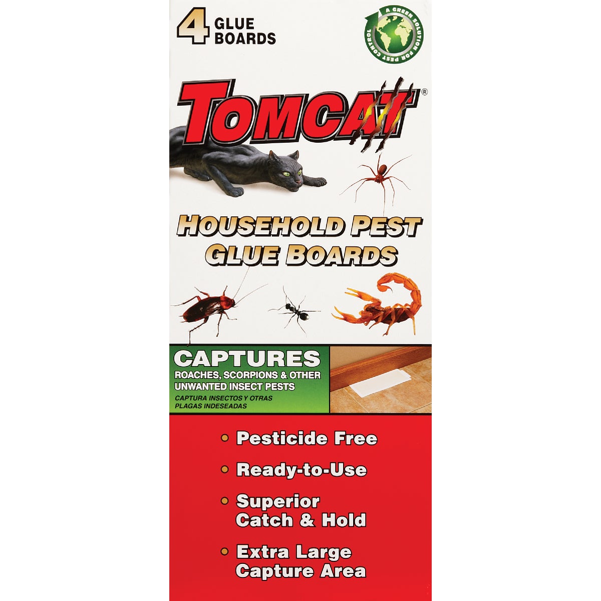 Captures ants, flying insects, roaches, spiders, and other unwanted pests in and around the house. Non-toxic, ready-to-use, superior catch and hold, extra large capture area. Pesticide-free formula. Includes 4 glue boards. Each glue board is 4 inches x 10 inches.