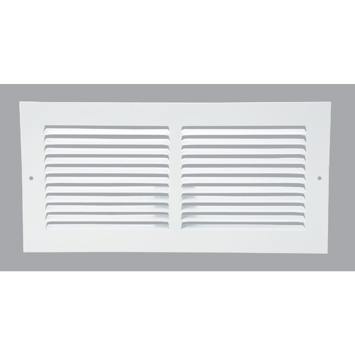 Stamped steel construction with turnback frame. 2 grille bars to an inch 40 deg. down defection. Size in description is opening size. White.