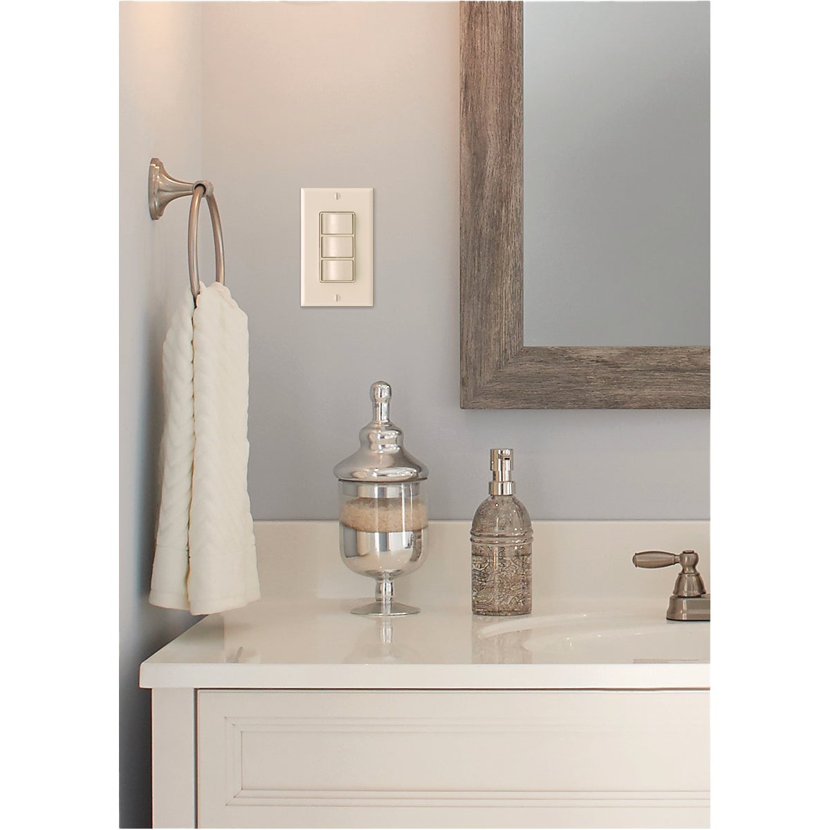 3-function rocker switch wall control will help get the most out of your bathroom ventilation fan by optimizing functionality and ease of use. Tri-rocker combination switch provides ability to manage two devices with one control. Can be used to control fan, light, heater, or nightlight. Design fits any modern decor. Simple installation saves time and money, single gang box saves space. Face plate not included.