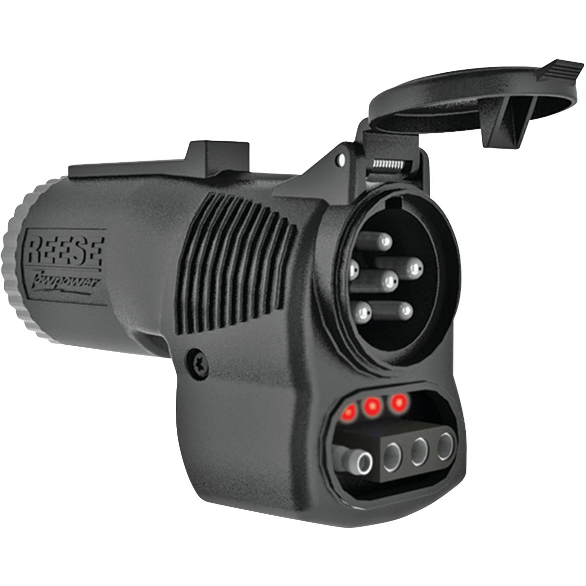 Reese Towpower towing adapter is designed to convert a 7-way blade connector to a 6-pin round, or a standard 4-way flat connector. It features a switchable 6-pin round to meet the trailer needs. It also includes the LED (light emitting diode) circuit tester which constantly checks for completed circuit confirmation. Not only can you adapt the trailer to vehicle fast, but you can be certain the connections are correct.