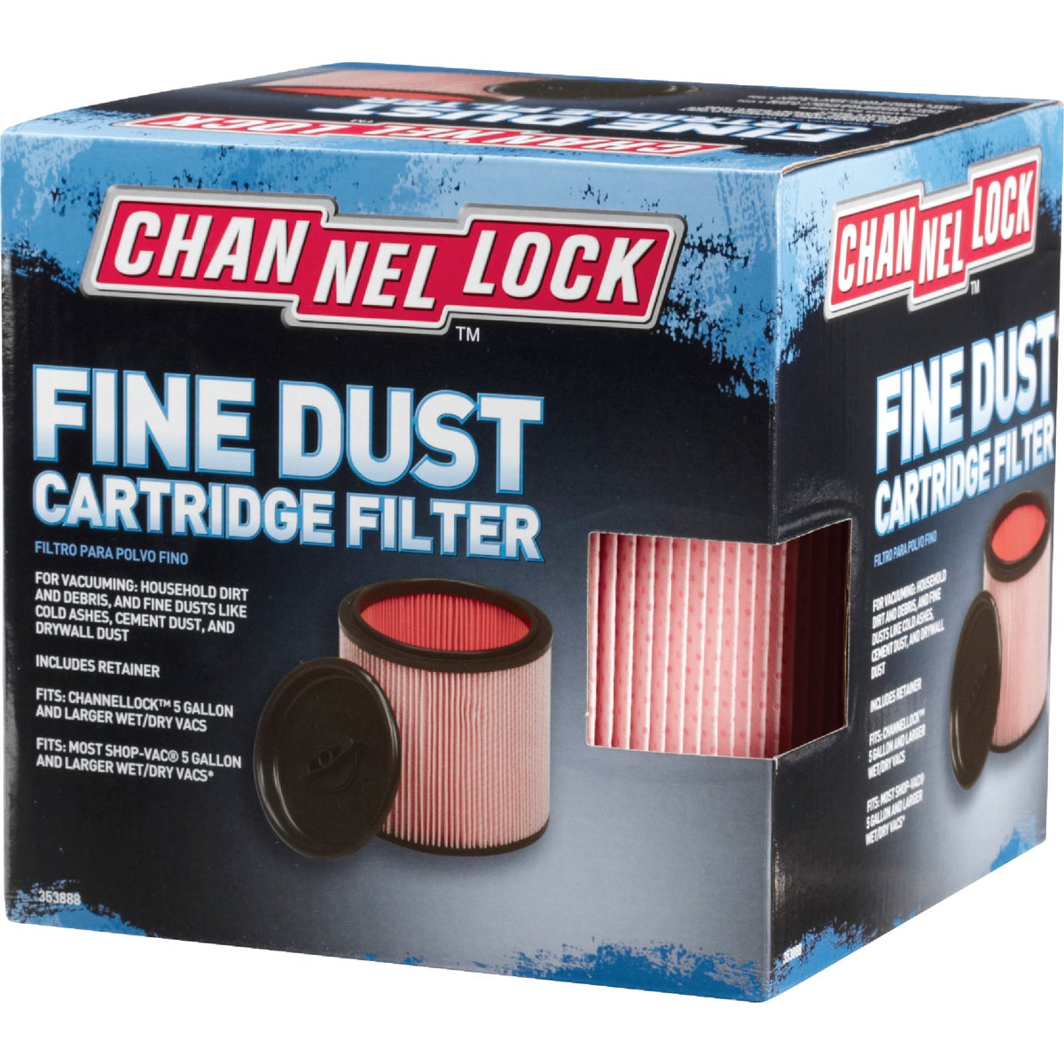 Replacement fine dust cartridge filter and retainer for wet/dry vacuum systems. Compatible with 5 to 20-gallon Channellock units. Also compatible with most Shop-Vac 5 gallon and larger wet/dry vacs.