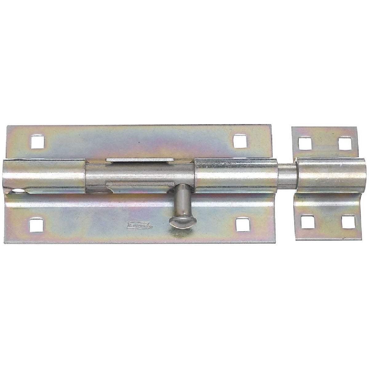 National Catalog Model V832. This bolt is designed for security on farm buildings, sheds, stockrooms, doors, and other heavy-duty installations. It can be padlocked for additional protection. Can be mounted with carriage bolts for added security. Surface and universal strikes are provided.